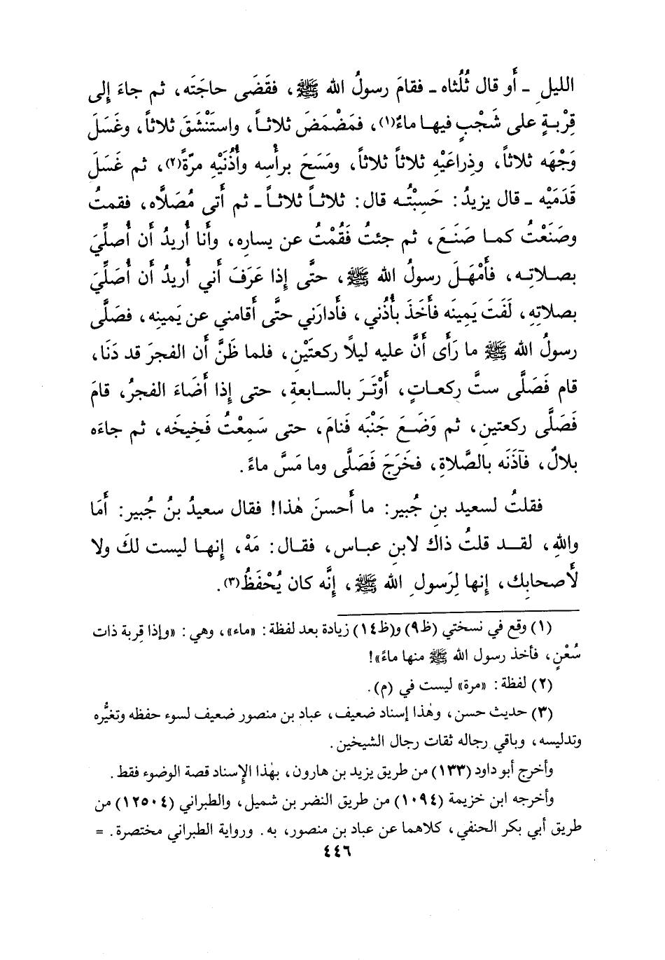 اللَّيْلِ - أَوْ قَالَ: ثُلُثَاهُ - فَقَامَ رَسُولُ اللهِ صَلَّى اللهُ عَلَيْهِ وَسَلَّمَ، فَقَضَى حَاجَتَهُ، ثُمَّ جَاءَ إِلَى قِرْبَةٍ عَلَى شَجْبٍ فِيهَا مَاءٌ (١) ، فَمَضْمَضَ ثَلَاثًا، وَاسْتَنْشَقَ ثَلَاثًا، وَغَسَلَ وَجْهَهُ ثَلَاثًا، وَذِرَاعَيْهِ ثَلَاثًا ثَلَاثًا، وَمَسَحَ بِرَأْسِهِ وَأُذُنَيْهِ مَرَّةً (٢) ، ثُمَّ غَسَلَ قَدَمَيْهِ - قَالَ يَزِيدُ: حَسِبْتُهُ قَالَ: ثَلَاثًا ثَلَاثًا - ثُمَّ أَتَى مُصَلَّاهُ، فَقُمْتُ وَصَنَعْتُ كَمَا صَنَعَ، ثُمَّ جِئْتُ فَقُمْتُ عَنْ يَسَارِهِ، وَأَنَا أُرِيدُ أَنْ أُصَلِّيَ بِصَلَاتِهِ، فَأَمْهَلَ رَسُولُ اللهِ صَلَّى اللهُ عَلَيْهِ وَسَلَّمَ، حَتَّى إِذَا عَرَفَ أَنِّي أُرِيدُ أَنْ أُصَلِّيَ بِصَلَاتِهِ، لَفَتَ يَمِينَهُ فَأَخَذَ بِأُذُنِي، فَأَدَارَنِي حَتَّى أَقَامَنِي عَنْ يَمِينِهِ، فَصَلَّى رَسُولُ اللهِ صَلَّى اللهُ عَلَيْهِ وَسَلَّمَ مَا رَأَى أَنَّ عَلَيْهِ لَيْلًا رَكْعَتَيْنِ، فَلَمَّا ظَنَّ أَنَّ الْفَجْرَ قَدْ دَنَا، قَامَ فَصَلَّى سِتَّ رَكَعَاتٍ، أَوْتَرَ بِالسَّابِعَةِ، حَتَّى إِذَا أَضَاءَ الْفَجْرُ، قَامَ فَصَلَّى رَكْعَتَيْنِ، ثُمَّ وَضَعَ جَنْبَهُ فَنَامَ، حَتَّى سَمِعْتُ فَخِيخَهُ، ثُمَّ جَاءَهُ بِلَالٌ، فَآذَنَهُ بِالصَّلَاةِ، فَخَرَجَ فَصَلَّى وَمَا مَسَّ مَاءً " فَقُلْتُ لِسَعِيدِ بْنِ جُبَيْرٍ: مَا أَحْسَنَ هَذَا فَقَالَ سَعِيدُ بْنُ جُبَيْرٍ: أَمَا وَاللهِ لَقَدْ قُلْتُ ذَاكَ لِابْنِ عَبَّاسٍ فَقَالَ: " مَهْ إِنَّهَا لَيْسَتْ لَكَ وَلَا لِأَصْحَابِكَ، إِنَّهَا لِرَسُولِ اللهِ صَلَّى اللهُ عَلَيْهِ وَسَلَّمَ إِنَّهُ كَانَ يَحْفَظُ " (٣)
