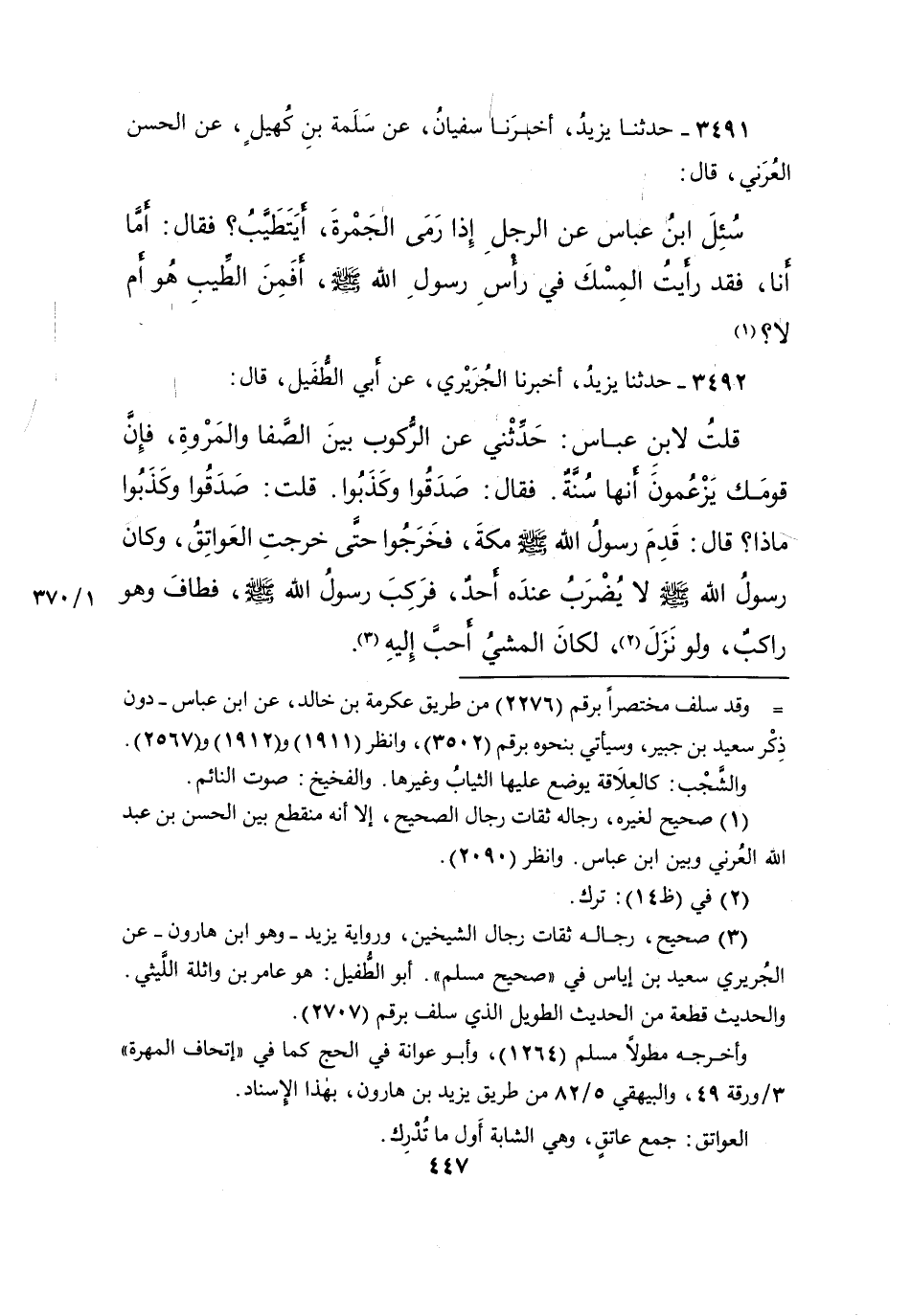 ٣٤٩١ - حَدَّثَنَا يَزِيدُ، أَخْبَرَنَا سُفْيَانُ، عَنْ سَلَمَةَ بْنِ كُهَيْلٍ، عَنِ الْحَسَنِ الْعُرَنِيِّ، قَالَ: سُئِلَ ابْنُ عَبَّاسٍ عَنِ الرَّجُلِ، إِذَا رَمَى الْجَمْرَةَ أَيَتَطَيَّبُ، فَقَالَ: أَمَّا أَنَا فَقَدْ " رَأَيْتُ الْمِسْكَ فِي رَأْسِ رَسُولِ اللهِ صَلَّى اللهُ عَلَيْهِ وَسَلَّمَ "، أَفَمِنَ الطِّيبِ هُوَ أَمْ لَا؟ (١)
