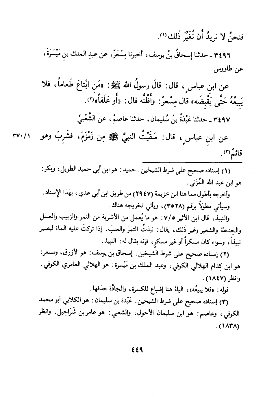 ٣٤٩٦ - حَدَّثَنَا إِسْحَاقُ بْنُ يُوسُفَ، أَخْبَرَنَا مِسْعَرٌ، عَنْ عَبْدِ الْمَلِكِ بْنِ مَيْسَرَةَ، عَنْ طَاوُسٍ، عَنْ ابْنِ عَبَّاسٍ، قَالَ: قَالَ رَسُولُ اللهِ صَلَّى اللهُ عَلَيْهِ وَسَلَّمَ: " مَنِ ابْتَاعَ طَعَامًا فَلَا يَبِعْهُ حَتَّى يَقْبِضَهُ " قَالَ مِسْعَرٌ: وَأَظُنُّهُ قَالَ: " أَوْ عَلَفًا " (٢)