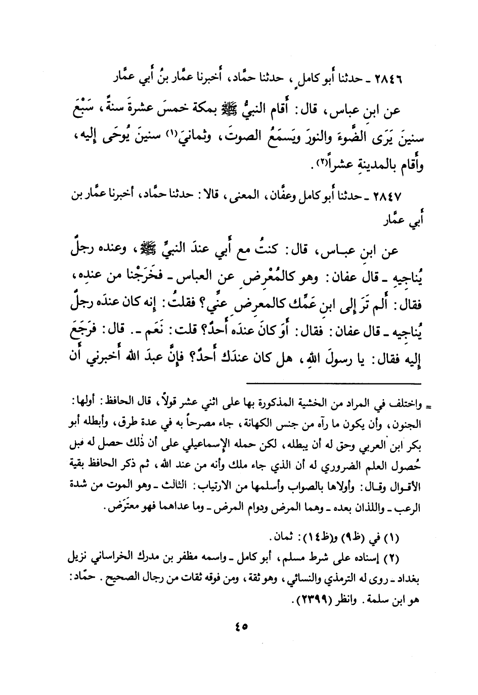 ٢٨٤٦ - حَدَّثَنَا أَبُو كَامِلٍ، حَدَّثَنَا حَمَّادٌ، أَخْبَرَنَا عَمَّارُ بْنُ أَبِي عَمَّارٍ، عَنِ ابْنِ عَبَّاسٍ، قَالَ: " أَقَامَ النَّبِيُّ صَلَّى اللهُ عَلَيْهِ وَسَلَّمَ بِمَكَّةَ خَمْسَ عَشْرَةَ سَنَةً، سَبْعَ سِنِينَ يَرَى الضَّوْءَ وَالنُّورَ وَيَسْمَعُ الصَّوْتَ، وَثَمَانِيَ (١) سِنِينَ يُوحَى إِلَيْهِ، وَأَقَامَ بِالْمَدِينَةِ عَشْرًا " (٢)