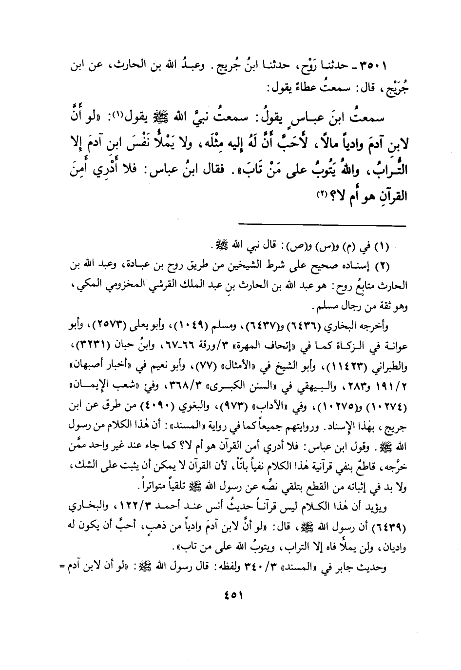 ٣٥٠١ - حَدَّثَنَا رَوْحٌ، حَدَّثَنَا ابْنُ جُرَيْجٍ، وَعَبْدُ اللهِ بْنُ الْحَارِثِ، عَنِ ابْنِ جُرَيْجٍ، قَالَ: سَمِعْتُ عَطَاءً، يَقُولُ: سَمِعْتُ ابْنَ عَبَّاسٍ، يَقُولُ: سَمِعْتُ نَبِيَّ اللهِ صَلَّى اللهُ عَلَيْهِ وَسَلَّمَ يَقُولُ (١) : " لَوْ أَنَّ لِابْنِ آدَمَ، وَادِيًا مَالًا لَأَحَبَّ أَنَّ لَهُ إِلَيْهِ مِثْلَهُ، وَلَا يَمْلَأُ نَفْسَ ابْنِ آدَمَ إِلَّا التُّرَابُ، وَاللهُ يَتُوبُ عَلَى مَنْ تَابَ " فَقَالَ ابْنُ عَبَّاسٍ: " فَلَا أَدْرِي أَمِنَ الْقُرْآنِ هُوَ أَمْ لَا؟ " (٢)