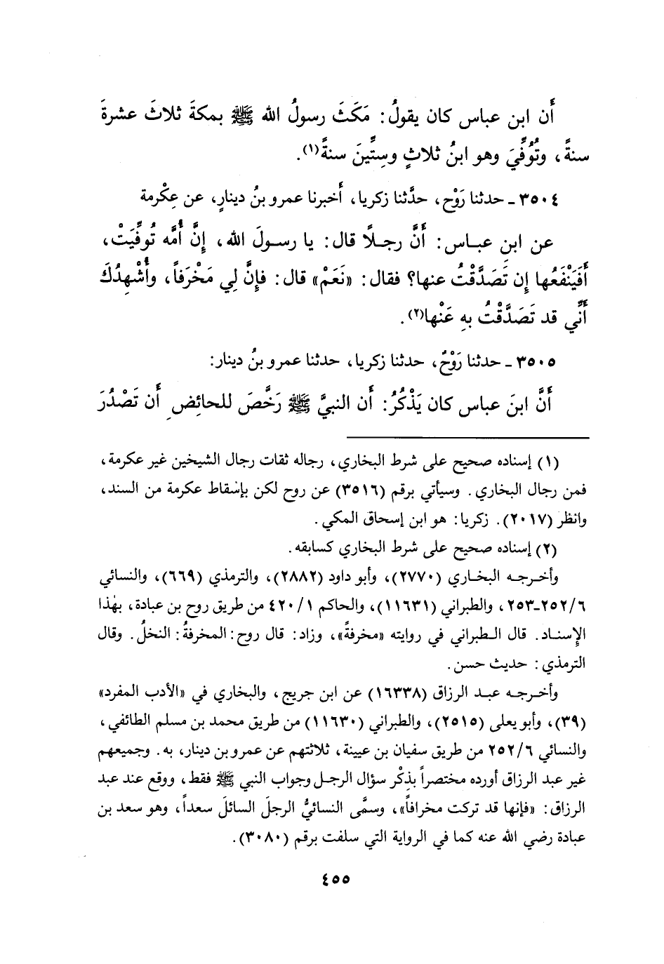 ٣٥٠٥ - حَدَّثَنَا رَوْحٌ، حَدَّثَنَا زَكَرِيَّا، حَدَّثَنَا عَمْرُو بْنُ دِينَارٍ، أَنَّ ابْنَ عَبَّاسٍ كَانَ يَذْكُرُ: " أَنَّ النَّبِيَّ صَلَّى اللهُ عَلَيْهِ وَسَلَّمَ رَخَّصَ لِلْحَائِضِ أَنْ تَصْدُرَ