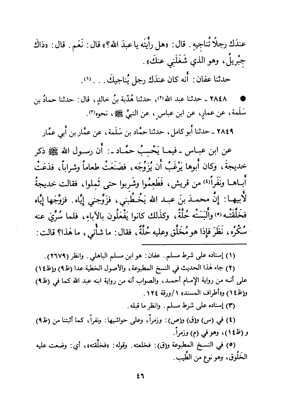 ٢٨٤٩ - حَدَّثَنَا أَبُو كَامِلٍ، حَدَّثَنَا حَمَّادُ بْنُ سَلَمَةَ، عَنْ عَمَّارِ بْنِ أَبِى عَمَّارٍ، عَنِ ابْنِ عَبَّاسٍ - فِيمَا يَحْسَبُ حَمَّادٌ -: أَنَّ رَسُولَ اللهِ صَلَّى اللهُ عَلَيْهِ وَسَلَّمَ " ذَكَرَ خَدِيجَةَ، وَكَانَ أَبُوهَا يَرْغَبُ أَنْ يُزَوِّجَهُ "، فَصَنَعَتْ طَعَامًا وَشَرَابًا، فَدَعَتْ أَبَاهَا وَنَفَرًا (٤) مِنْ قُرَيْشٍ، فَطَعِمُوا وَشَرِبُوا حَتَّى ثَمِلُوا، فَقَالَتْ خَدِيجَةُ لِأَبِيهَا: إِنَّ مُحَمَّدَ بْنَ عَبْدِ اللهِ يَخْطُبُنِي، فَزَوِّجْنِي إِيَّاهُ. فَزَوَّجَهَا إِيَّاهُ فخلَّقَتْهُ (٥) وَأَلْبَسَتْهُ حُلَّةً، وَكَذَلِكَ كَانُوا يَفْعَلُونَ بِالْآبَاءِ، فَلَمَّا سُرِّيَ عَنْهُ سُكْرُهُ، نَظَرَ فَإِذَا هُوَ مُخَلَّقٌ وَعَلَيْهِ حُلَّةٌ، فَقَالَ: مَا شَأْنِي، مَا هَذَا؟ قَالَتْ: