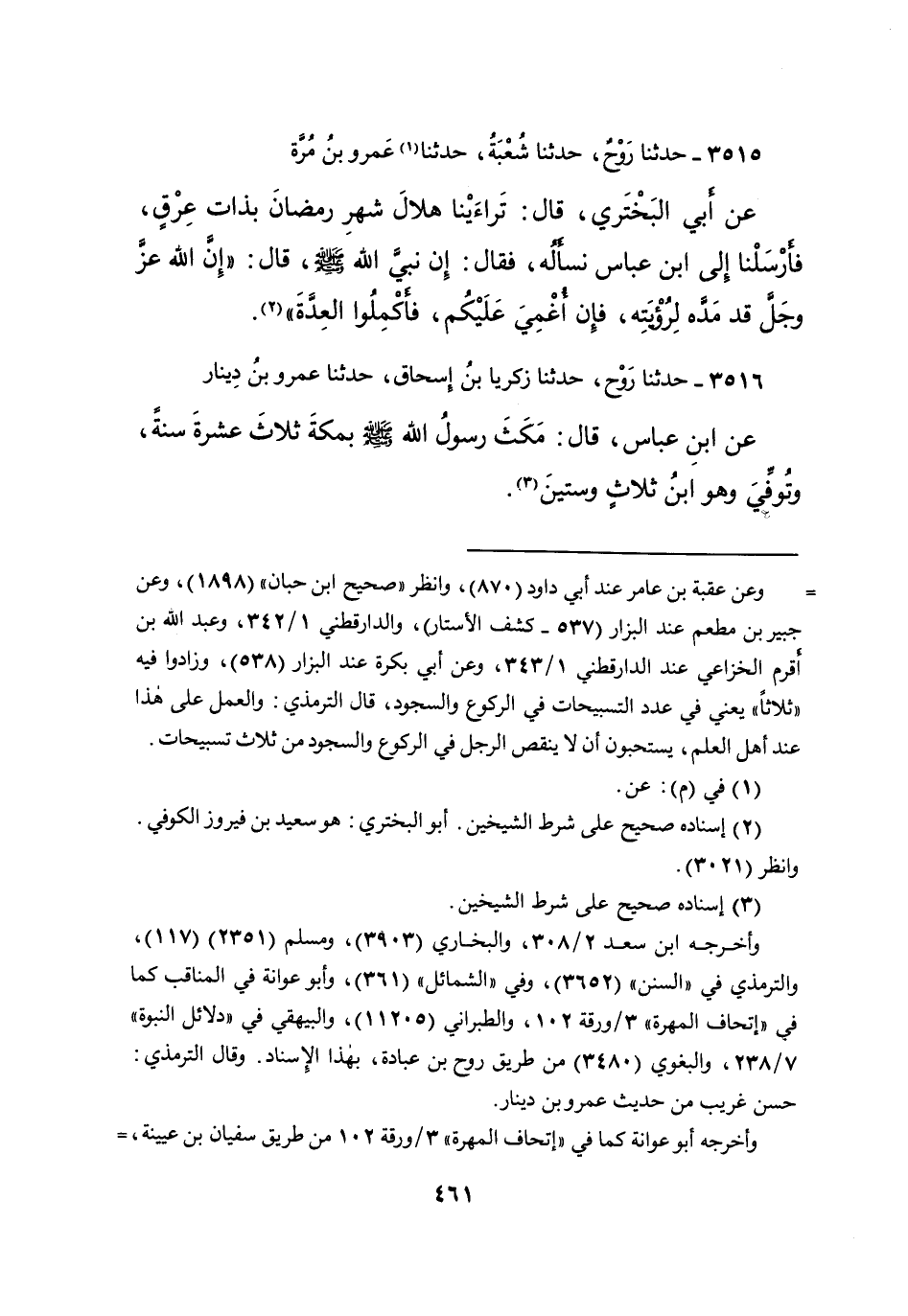 ٣٥١٦ - حَدَّثَنَا رَوْحٌ، حَدَّثَنَا زَكَرِيَّا بْنُ إِسْحَاقَ، حَدَّثَنَا عَمْرُو بْنُ دِينَارٍ، عَنِ ابْنِ عَبَّاسٍ، قَالَ: " مَكَثَ رَسُولُ اللهِ صَلَّى اللهُ عَلَيْهِ وَسَلَّمَ بِمَكَّةَ ثَلَاثَ عَشْرَةَ سَنَةً، وَتُوُفِّيَ وَهُوَ ابْنُ ثَلَاثٍ وَسِتِّينَ " (٣)