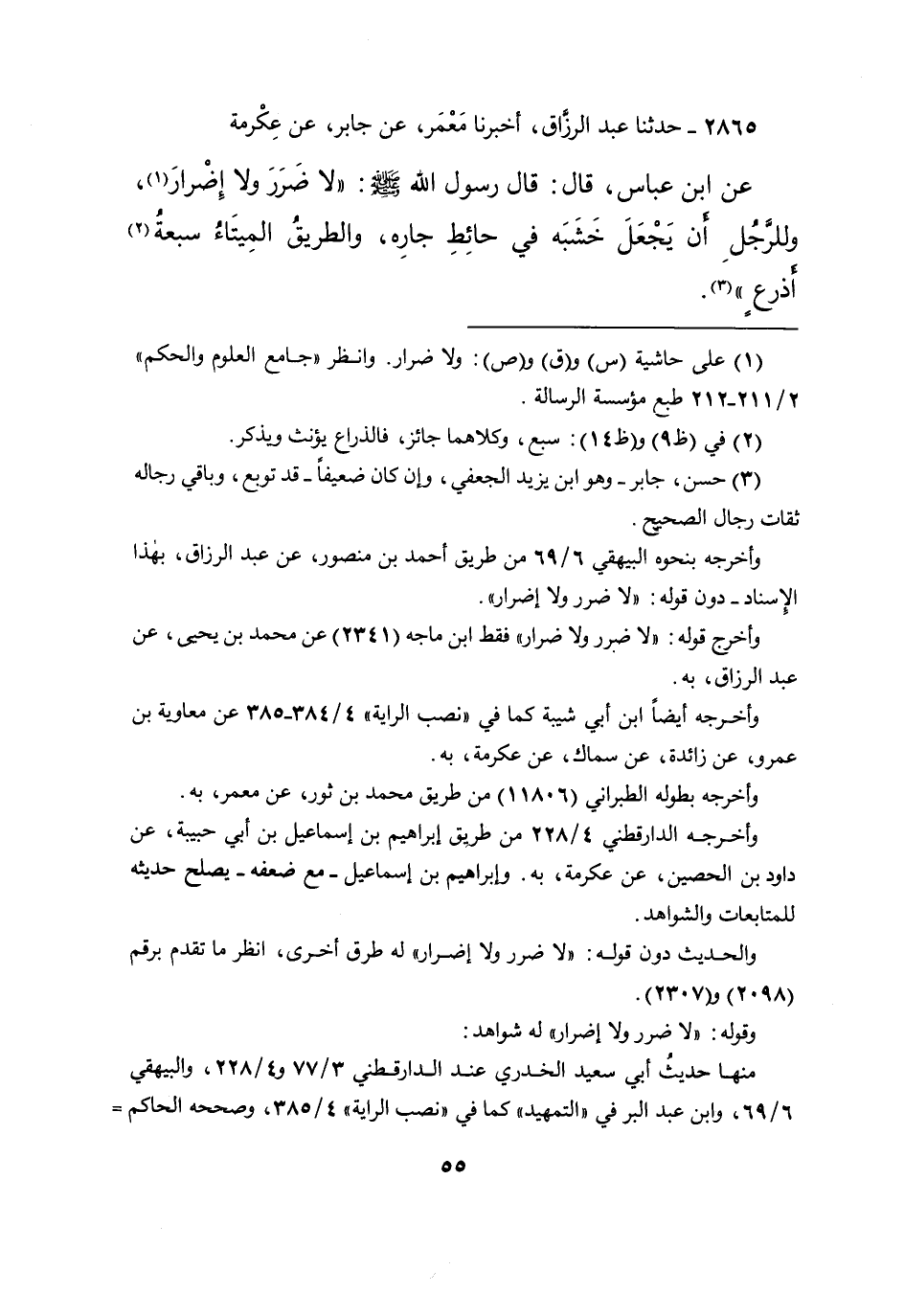 ٢٨٦٥ - حَدَّثَنَا عَبْدُ الرَّزَّاقِ، أَخْبَرَنَا مَعْمَرٌ، عَنْ جَابِرٍ، عَنْ عِكْرِمَةَ، عَنِ ابْنِ عَبَّاسٍ، قَالَ: قَالَ رَسُولُ اللهِ صَلَّى اللهُ عَلَيْهِ وَسَلَّمَ: " لَا ضَرَرَ وَلَا ضِرَارَ، (١) وَلِلرَّجُلِ أَنْ يَجْعَلَ خَشَبَةً فِي حَائِطِ جَارِهِ، وَالطَّرِيقُ الْمِيتَاءُ سَبْعَةُ (٢) أَذْرُعٍ " (٣)