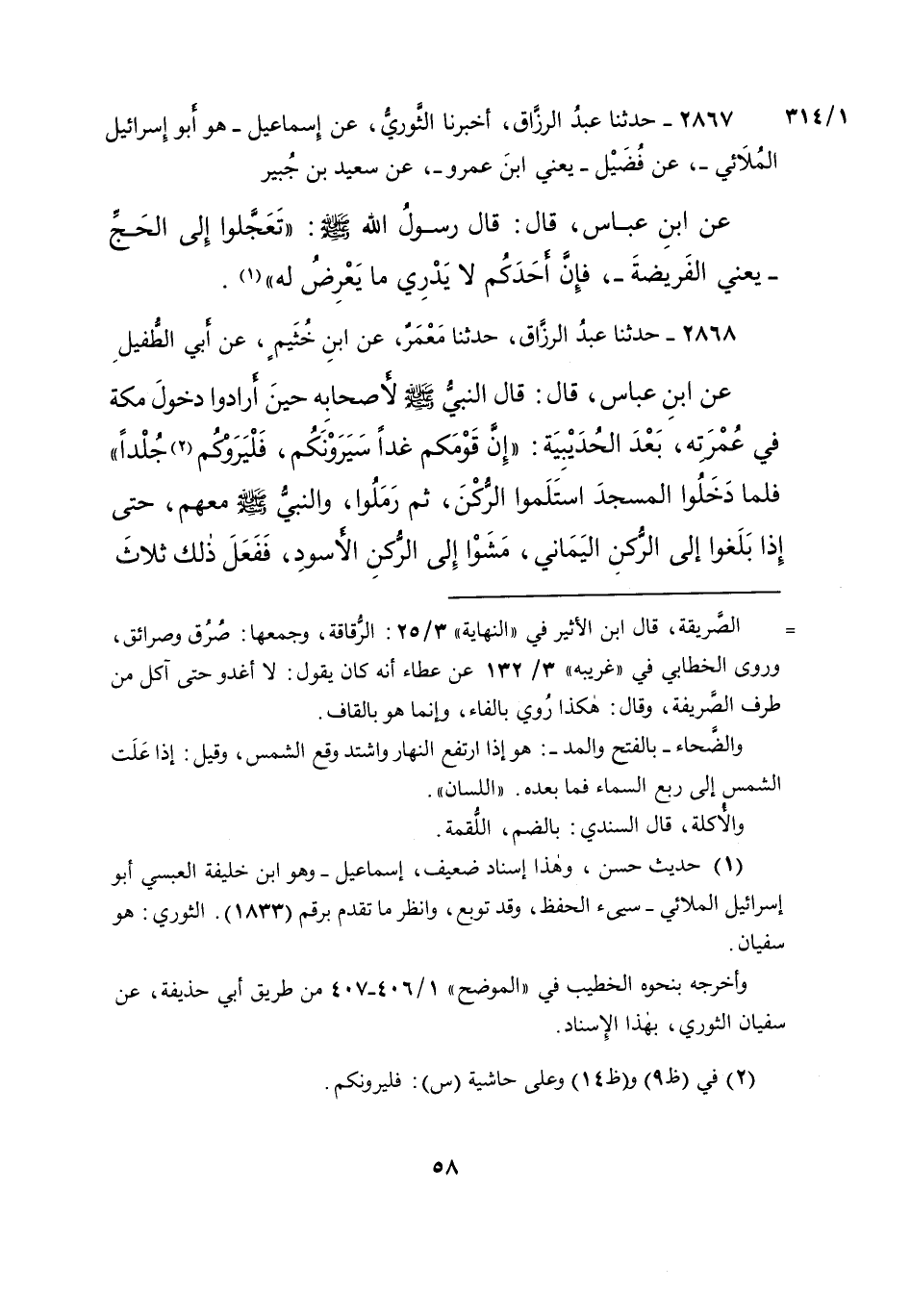 ٢٨٦٧ - حَدَّثَنَا عَبْدُ الرَّزَّاقِ، أَخْبَرَنَا الثَّوْرِيُّ، عَنْ إِسْمَاعِيلَ هُوَ أَبُو إِسْرَائِيلَ الْمُلائِيُّ، عَنْ فُضَيْلٍ يَعْنِي ابْنَ عَمْرٍو، عَنْ سَعِيدِ بْنِ جُبَيْرٍ، عَنِ ابْنِ عَبَّاسٍ قَالَ: قَالَ رَسُولُ اللهِ صَلَّى اللهُ عَلَيْهِ وَسَلَّمَ: " تَعَجَّلُوا إِلَى الْحَجِّ - يَعْنِي: الْفَرِيضَةَ - فَإِنَّ أَحَدَكُمْ لَا يَدْرِي مَا يَعْرِضُ لَهُ " (١)