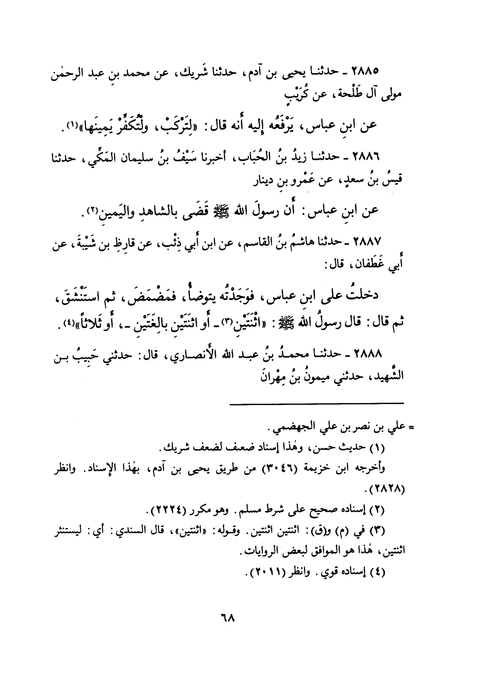 ٢٨٨٧ - حَدَّثَنَا هَاشِمُ بْنُ الْقَاسِمِ، عَنِ ابْنِ أَبِي ذِئْبٍ، عَنْ قَارِظِ بْنِ شَيْبَةَ، عَنْ أَبِي غَطَفَانَ، قَالَ: دَخَلْتُ عَلَى ابْنِ عَبَّاسٍ، فَوَجَدْتُهُ يَتَوَضَّأُ، فَمَضْمَضَ، ثُمَّ اسْتَنْشَقَ، ثُمَّ قَالَ: قَالَ رَسُولُ اللهِ صَلَّى اللهُ عَلَيْهِ وَسَلَّمَ: " اثْنَتَيْنِ (٣) ، أَوْ ثِنْتَيْنِ بَالِغَتَيْنِ، أَوْ ثَلَاثًا " (٤)