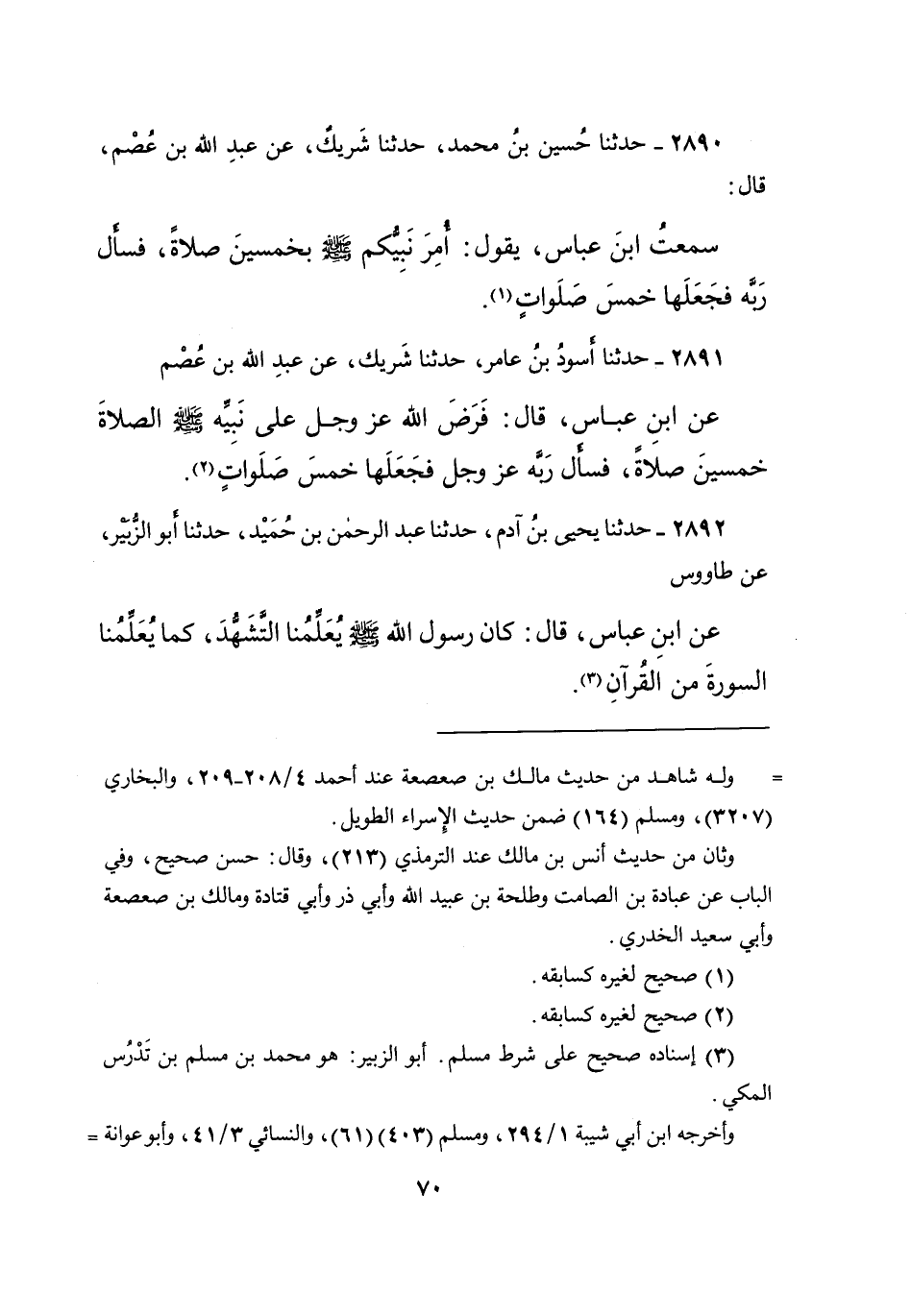 ٢٨٩٠ - حَدَّثَنَا حُسَيْنُ بْنُ مُحَمَّدٍ، حَدَّثَنَا شَرِيكٌ، عَنْ عَبْدِ اللهِ بْنِ عُصْمٍ، قَالَ: سَمِعْتُ ابْنَ عَبَّاسٍ، يَقُولُ: " أُمِرَ نَبِيُّكُمْ صَلَّى اللهُ عَلَيْهِ وَسَلَّمَ بِخَمْسِينَ صَلاةً، فَسَأَلَ رَبَّهُ فَجَعَلَهَا خَمْسَ صَلَوَاتٍ " (١)