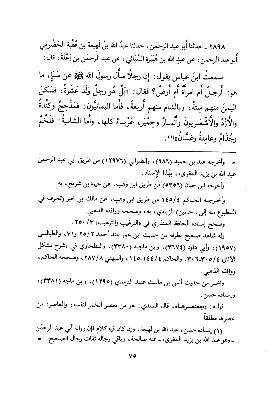 ٢٨٩٨ - حَدَّثَنَا أَبُو عَبْدِ الرَّحْمَنِ، حَدَّثَنَا عَبْدُ اللهِ بْنُ لَهِيعَةَ بْنِ عُقْبَةَ الْحَضْرَمِيُّ أَبُو عَبْدِ الرَّحْمَنِ، عَنْ عَبْدِ اللهِ بْنِ هُبَيْرَةَ السَّبَائِيِّ، عَنْ عَبْدِ الرَّحْمَنِ بْنِ وَعْلَةَ، قَالَ: سَمِعْتُ ابْنَ عَبَّاسٍ، يَقُولُ: إِنَّ رَجُلًا سَأَلَ رَسُولَ اللهِ صَلَّى اللهُ عَلَيْهِ وَسَلَّمَ عَنْ سَبَأٍ، مَا هُوَ: أَرَجُلٌ أَمِ امْرَأَةٌ أَمْ أَرْضٌ؟ فَقَالَ: " بَلْ هُوَ رَجُلٌ وَلَدَ عَشْرَةً، فَسَكَنَ الْيَمَنَ مِنْهُمْ سِتَّةٌ، وَبِالشَّامِ مِنْهُمْ أَرْبَعَةٌ، فَأَمَّا الْيَمَانِيُّونَ: فَمَذْحِجٌ وَكِنْدَةُ وَالْأَزْدُ وَالْأَشْعَرِيُّونَ وَأَنْمَارٌ وَحِمْيَرُ، عَرَبًا كُلَّهَا، وَأَمَّا الشَّامِيَّةُ: فَلَخْمٌ وَجُذَامُ وَعَامِلَةُ وَغَسَّانُ " (١)