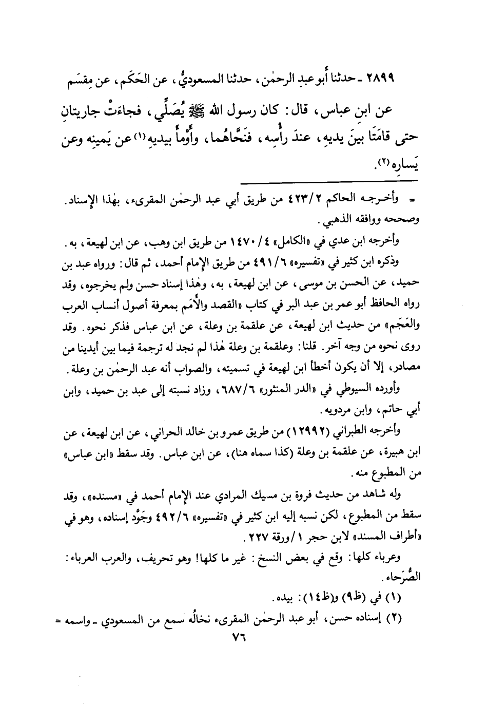 ٢٨٩٩ - حَدَّثَنَا أَبُو عَبْدِ الرَّحْمَنِ، حَدَّثَنَا الْمَسْعُودِيُّ، عَنِ الْحَكَمِ، عَنْ مِقْسَمٍ، عَنِ ابْنِ عَبَّاسٍ، قَالَ: " كَانَ رَسُولُ اللهِ صَلَّى اللهُ عَلَيْهِ وَسَلَّمَ يُصَلِّي، فَجَاءَتْ جَارِيَتَانِ حَتَّى قَامَتَا بَيْنَ يَدَيْهِ، عِنْدَ رَأْسِهِ، فَنَحَّاهُمَا، وَأَوْمَأَ بِيَدَيْهِ (١) عَنْ يَمِينِهِ وَعَنْ يَسَارِهِ " (٢)