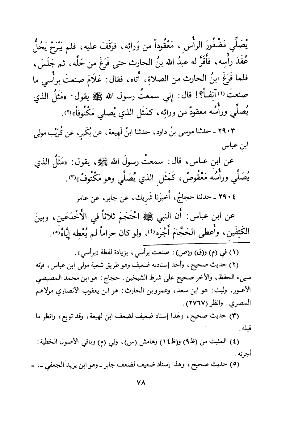٢٩٠٣ - حَدَّثَنَا مُوسَى بْنُ دَاوُدَ، حَدَّثَنَا ابْنُ لَهِيعَةَ، عَنْ بُكَيْرٍ، عَنْ كُرَيْبٍ، مَوْلَى ابْنِ عَبَّاسٍ، عَنِ ابْنِ عَبَّاسٍ، قَالَ: سَمِعْتُ رَسُولَ اللهِ صَلَّى اللهُ عَلَيْهِ وَسَلَّمَ يَقُولُ: " مَثَلُ الَّذِي يُصَلِّي وَرَأْسُهُ مَعْقُوصٌ، كَمَثَلِ الَّذِي يُصَلِّي وَهُوَ مَكْتُوفٌ " (٣)