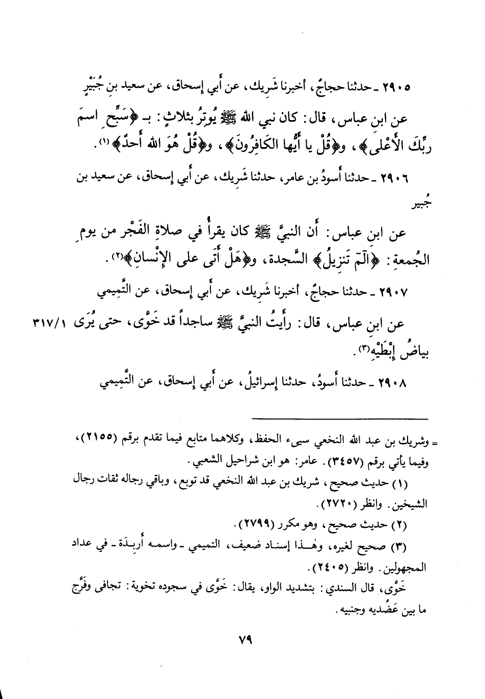 ٢٩٠٥ - حَدَّثَنَا حَجَّاجٌ، أَخْبَرَنَا شَرِيكٌ، عَنْ أَبِي إِسْحَاقَ، عَنْ سَعِيدِ بْنِ جُبَيْرٍ، عَنِ ابْنِ عَبَّاسٍ، قَالَ: " كَانَ نَبِيُّ اللهِ صَلَّى اللهُ عَلَيْهِ وَسَلَّمَ يُوتِرُ بِثَلاثٍ: بِسَبِّحِ اسْمَ رَبِّكَ الْأَعْلَى، وَقُلْ يَا أَيُّهَا الْكَافِرُونَ، وَقُلْ هُوَ اللهُ أَحَدٌ " (١)