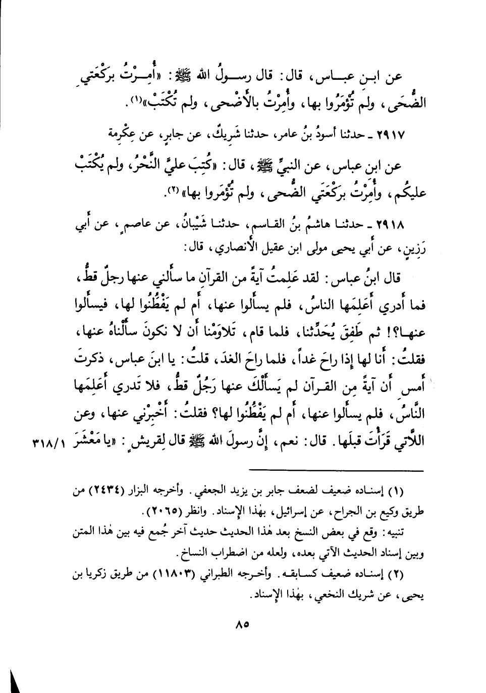 ٢٩١٧ - حَدَّثَنَا أَسْوَدُ بْنُ عَامِرٍ، حَدَّثَنَا شَرِيكٌ، عَنْ جَابِرٍ، عَنْ عِكْرِمَةَ، عَنِ ابْنِ عَبَّاسٍ، عَنِ النَّبِيِّ صَلَّى اللهُ عَلَيْهِ وَسَلَّمَ قَالَ: " كُتِبَ عَلَيَّ النَّحْرُ، وَلَمْ يُكْتَبْ عَلَيْكُمْ، وَأُمِرْتُ بِرَكْعَتَيِ الضُّحَى، وَلَمْ تُؤْمَرُوا بِهَا " (٢)