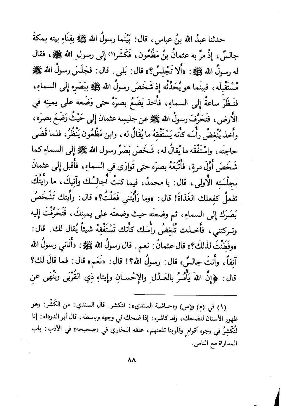 حَدَّثَنَا عَبْدُ اللهِ بْنُ عَبَّاسٍ، قَالَ: بَيْنَمَا رَسُولُ اللهِ صَلَّى اللهُ عَلَيْهِ وَسَلَّمَ بِفِنَاءِ بَيْتِهِ بِمَكَّةَ جَالِسٌ، إِذْ مَرَّ بِهِ عُثْمَانُ بْنُ مَظْعُونٍ، فَكَشَرَ (١) إِلَى رَسُولِ اللهِ صَلَّى اللهُ عَلَيْهِ وَسَلَّمَ، فَقَالَ لَهُ رَسُولُ اللهِ صَلَّى اللهُ عَلَيْهِ وَسَلَّمَ: " أَلا تَجْلِسُ؟ " قَالَ: بَلَى. قَالَ: فَجَلَسَ رَسُولُ اللهِ صَلَّى اللهُ عَلَيْهِ وَسَلَّمَ مُسْتَقْبِلَهُ، فَبَيْنَمَا هُوَ يُحَدِّثُهُ إِذْ شَخَصَ رَسُولُ اللهِ صَلَّى اللهُ عَلَيْهِ وَسَلَّمَ بِبَصَرِهِ إِلَى السَّمَاءِ، فَنَظَرَ سَاعَةً إِلَى السَّمَاءِ، فَأَخَذَ يَضَعُ بَصَرَهُ حَتَّى وَضَعَهُ عَلَى يَمِينِهِ فِي الْأَرْضِ، فَتَحَرَّفَ رَسُولُ اللهِ صَلَّى اللهُ عَلَيْهِ وَسَلَّمَ عَنْ جَلِيسِهِ عُثْمَانَ إِلَى حَيْثُ وَضَعَ بَصَرَهُ، وَأَخَذَ يُنْغِضُ رَأْسَهُ كَأَنَّهُ يَسْتَفْقِهُ مَا يُقَالُ لَهُ، وَابْنُ مَظْعُونٍ يَنْظُرُ، فَلَمَّا قَضَى حَاجَتَهُ، وَاسْتَفْقَهَ مَا يُقَالُ لَهُ، شَخَصَ بَصَرُ رَسُولِ اللهِ صَلَّى اللهُ عَلَيْهِ وَسَلَّمَ إِلَى السَّمَاءِ كَمَا شَخَصَ أَوَّلَ مَرَّةٍ، فَأَتْبَعَهُ بَصَرَهُ حَتَّى تَوَارَى فِي السَّمَاءِ، فَأَقْبَلَ إِلَى عُثْمَانَ بِجِلْسَتِهِ الْأُولَى، قَالَ: يَا مُحَمَّدُ، فِيمَ كُنْتُ أُجَالِسُكَ وَآتِيكَ، مَا رَأَيْتُكَ تَفْعَلُ كَفِعْلِكَ الْغَدَاةَ قَالَ: " وَمَا رَأَيْتَنِي فَعَلْتُ؟ " قَالَ: رَأَيْتُكَ تَشْخَصُ بِبَصَرِكَ إِلَى السَّمَاءِ، ثُمَّ وَضَعْتَهُ حَيْثُ وَضَعْتَهُ عَلَى يَمِينِكَ، فَتَحَرَّفْتَ إِلَيْهِ وَتَرَكْتَنِي، فَأَخَذْتَ تُنْغِضُ رَأْسَكَ كَأَنَّكَ تَسْتَفْقِهُ شَيْئًا يُقَالُ لَكَ. قَالَ: " وَفَطِنْتَ لِذَاكَ؟ " قَالَ عُثْمَانُ: نَعَمْ. قَالَ رَسُولُ اللهِ صَلَّى اللهُ عَلَيْهِ وَسَلَّمَ: " أَتَانِي رَسُولُ اللهِ آنِفًا، وَأَنْتَ جَالِسٌ " قَالَ: رَسُولُ اللهِ؟ قَالَ: " نَعَمْ " قَالَ: فَمَا قَالَ لَكَ؟ قَالَ: {إِنَّ اللهَ يَأْمُرُ بِالْعَدْلِ وَالْإِحْسَانِ وَإِيتَاءِ ذِي الْقُرْبَى وَيَنْهَى عَنِ
