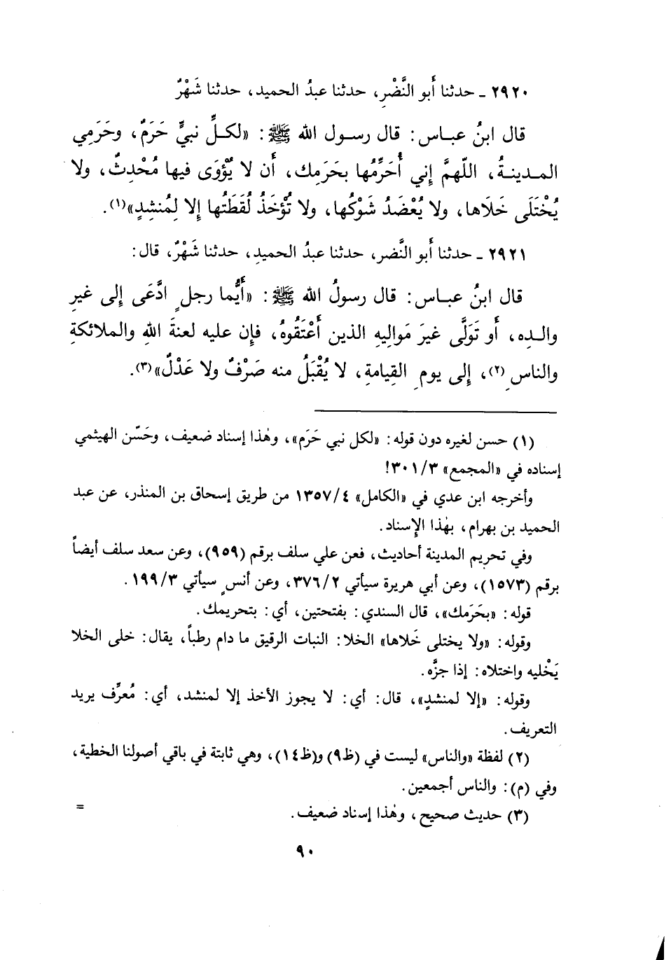 ٢٩٢٠ - حَدَّثَنَا أَبُو النَّضْرِ، حَدَّثَنَا عَبْدُ الْحَمِيدِ، حَدَّثَنَا شَهْرٌ، قَالَ ابْنُ عَبَّاسٍ: قَالَ رَسُولُ اللهِ صَلَّى اللهُ عَلَيْهِ وَسَلَّمَ: " لِكُلِّ نَبِيٍّ حَرَمٌ، وَحَرَمِي الْمَدِينَةُ، اللهُمَّ إِنِّي أُحَرِّمُهَا بِحُرَمِكَ، أَنْ لَا يُؤْوَى فِيهَا مُحْدِثٌ، وَلا يُخْتَلَى خَلاهَا، وَلا يُعْضَدُ شَوْكُهَا، وَلا تُؤْخَذُ لُقَطَتُهَا إِلا لِمُنْشِدٍ " (١)