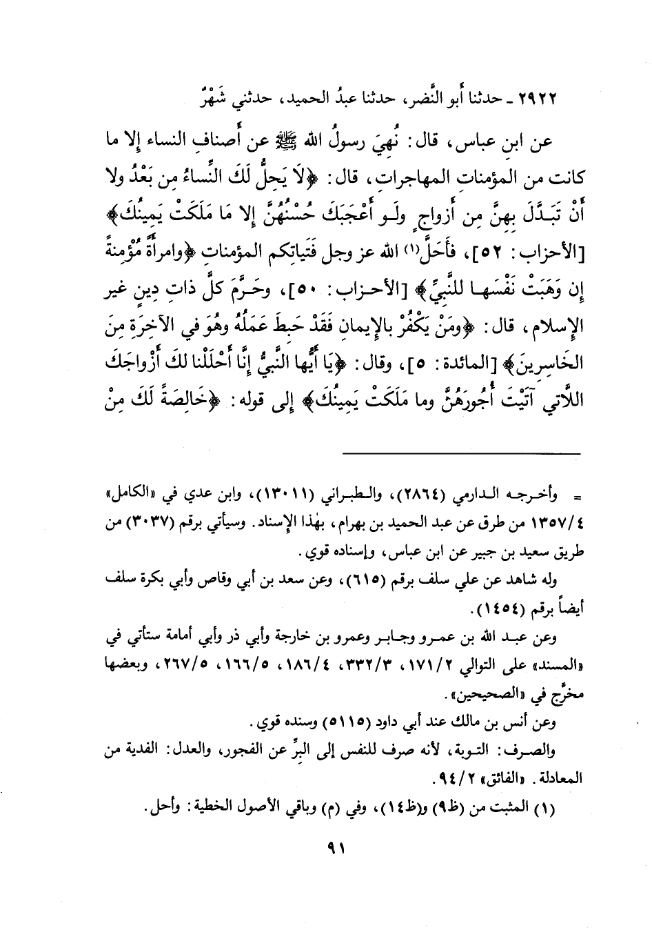 ٢٩٢٢ - حَدَّثَنَا أَبُو النَّضْرِ، حَدَّثَنَا عَبْدُ الْحَمِيدِ، حَدَّثَنِي شَهْرٌ، عَنِ ابْنِ عَبَّاسٍ، قَالَ: " نُهِيَ رَسُولُ اللهِ صَلَّى اللهُ عَلَيْهِ وَسَلَّمَ عَنْ أَصْنَافِ النِّسَاءِ إِلَّا مَا كَانَتْ مِنَ المُؤْمِنَاتِ الْمُهَاجِرَاتِ، قَالَ: {لَا يَحِلُّ لَكَ النِّسَاءُ مِنْ بَعْدُ وَلَا أَنْ تَبَدَّلَ بِهِنَّ مِنْ أَزْوَاجٍ وَلَوْ أَعْجَبَكَ حُسْنُهُنَّ إِلَّا مَا مَلَكَتْ يَمِينُكَ} [الأحزاب: ٥٢] ، فَأَحَلَّ (١) اللهُ عَزَّ وَجَلَّ فَتَيَاتِكُمِ الْمُؤْمِنَاتِ {وَامْرَأَةً مُؤْمِنَةً إِنْ وَهَبَتْ نَفْسَهَا لِلنَّبِيِّ} [الأحزاب: ٥٠] ، وَحَرَّمَ كُلَّ ذَاتِ دِينٍ غَيْرَ دِينِ الْإِسْلامِ، قَالَ: {وَمَنْ يَكْفُرْ بِالْإِيمَانِ فَقَدْ حَبِطَ عَمَلُهُ وَهُوَ فِي الْآخِرَةِ مِنَ الخَاسِرِينَ} [المائدة: ٥] ، وَقَالَ: {يَا أَيُّهَا النَّبِيُّ إِنَّا أَحْلَلْنَا لَكَ أَزْوَاجَكَ اللاتِي آتَيْتَ أُجُورَهُنَّ وَمَا مَلَكَتْ يَمِينُكَ} [الأحزاب: ٥٠]- إِلَى قَوْلِهِ - {خَالِصَةً لَكَ مِنْ