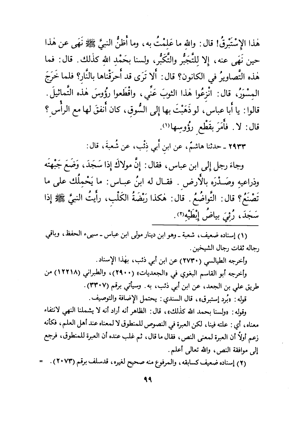 ٢٩٣٣ - حَدَّثَنَا هَاشِمٌ، عَنِ ابْنِ أَبِي ذِئْبٍ، عَنْ شُعْبَةَ، قَالَ: وَجَاءَ رَجُلٌ إِلَى ابْنِ عَبَّاسٍ، فَقَالَ: إِنَّ مَوْلاكَ إِذَا سَجَدَ، وَضَعَ جَبْهَتَهُ وَذِرَاعَيْهِ وَصَدْرَهُ بِالْأَرْضِ. فَقَالَ لَهُ ابْنُ عَبَّاسٍ: مَا يَحْمِلُكَ عَلَى مَا تَصْنَعُ؟ قَالَ: التَّوَاضُعُ. قَالَ: هَكَذَا رِبْضَةُ الْكَلْبِ، رَأَيْتُ النَّبِيَّ صَلَّى اللهُ عَلَيْهِ وَسَلَّمَ " إِذَا سَجَدَ، رُئِيَ بَيَاضُ إِبْطَيْهِ " (٢)