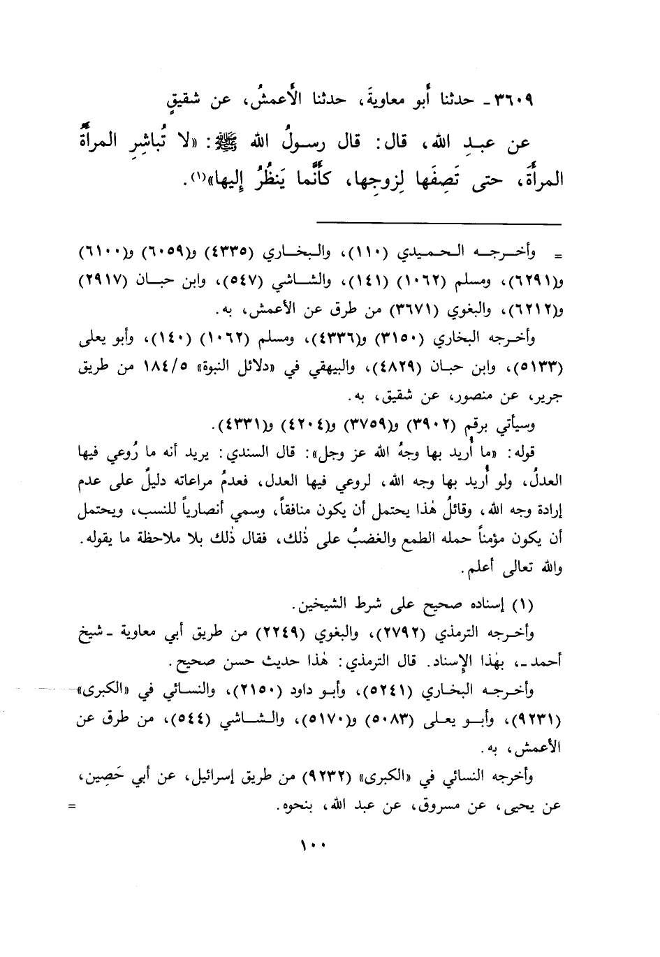 ٣٦٠٩ - حَدَّثَنَا أَبُو مُعَاوِيَةَ، حَدَّثَنَا الْأَعْمَشُ، عَنْ شَقِيقٍ، عَنْ عَبْدِ اللهِ، قَالَ: قَالَ رَسُولُ اللهِ صَلَّى اللهُ عَلَيْهِ وَسَلَّمَ: " لَا تُبَاشِرِ الْمَرْأَةُ الْمَرْأَةَ، حَتَّى تَصِفَهَا لِزَوْجِهَا، كَأَنَّمَا يَنْظُرُ إِلَيْهَا " (١)
