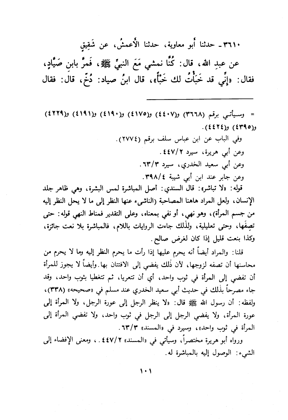 ٣٦١٠ - حَدَّثَنَا أَبُو مُعَاوِيَةَ، حَدَّثَنَا الْأَعْمَشُ، عَنْ شَقِيقٍ، عَنْ عَبْدِ اللهِ، قَالَ: كُنَّا نَمْشِي مَعَ النَّبِيِّ صَلَّى اللهُ عَلَيْهِ وَسَلَّمَ، فَمَرَّ بِابْنِ صَيَّادٍ، فَقَالَ: " إِنِّي قَدْ خَبَأْتُ لَكَ خَبْئًا "، قَالَ ابْنُ صَيَّادٍ: دُخٌّ، قَالَ: فَقَالَ