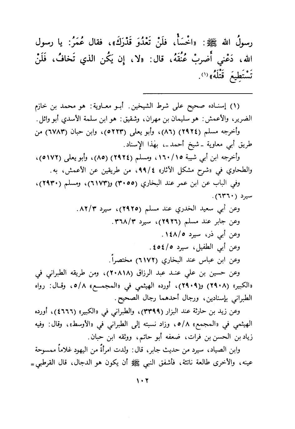 رَسُولُ اللهِ صَلَّى اللهُ عَلَيْهِ وَسَلَّمَ: " اخْسَأْ، فَلَنْ تَعْدُوَ قَدْرَكَ " فَقَالَ عُمَرُ: يَا رَسُولَ اللهِ، دَعْنِي أَضْرِبْ عُنُقَهُ، قَالَ: " لَا، إِنْ يَكُنِ الَّذِي تَخَافُ، فَلَنْ تَسْتَطِيعَ قَتْلَهُ " (١)