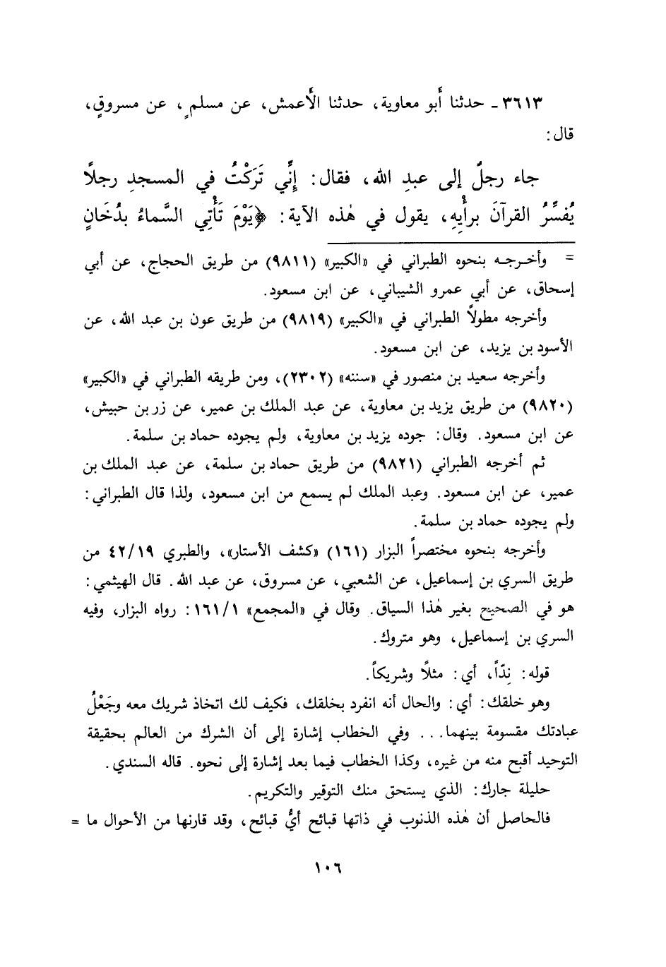 ٣٦١٣ - حَدَّثَنَا أَبُو مُعَاوِيَةَ، حَدَّثَنَا الْأَعْمَشُ، عَنْ مُسْلِمٍ، عَنْ مَسْرُوقٍ، قَالَ: جَاءَ رَجُلٌ إِلَى عَبْدِ اللهِ، فَقَالَ: إِنِّي تَرَكْتُ فِي الْمَسْجِدِ رَجُلًا يُفَسِّرُ الْقُرْآنَ بِرَأْيِهِ، يَقُولُ فِي هَذِهِ الْآيَةِ: {يَوْمَ تَأْتِي السَّمَاءُ بِدُخَانٍ