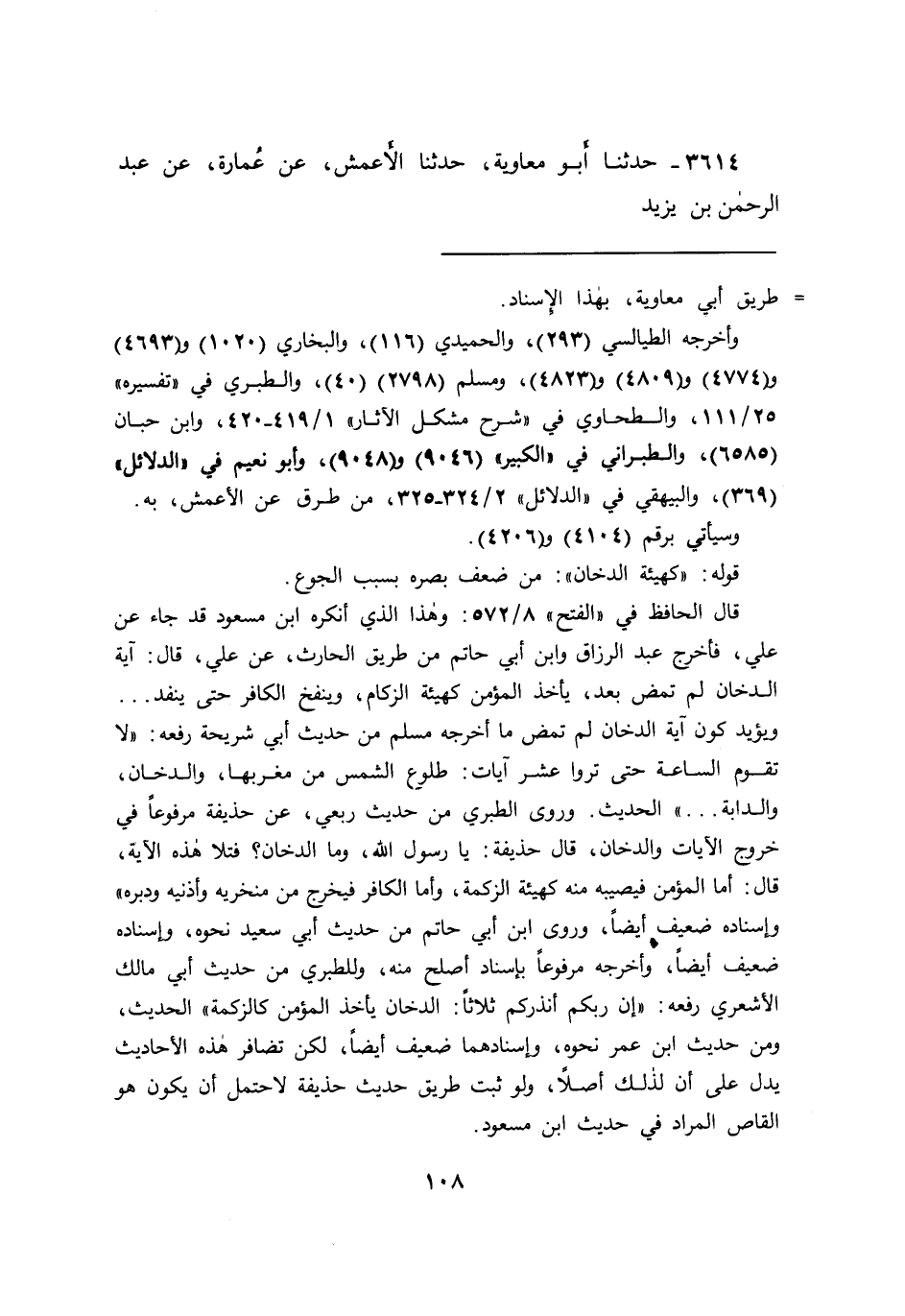 ٣٦١٤ - حَدَّثَنَا أَبُو مُعَاوِيَةَ، حَدَّثَنَا الْأَعْمَشُ، عَنْ عُمَارَةَ، عَنْ عَبْدِ الرَّحْمَنِ بْنِ يَزِيدَ،