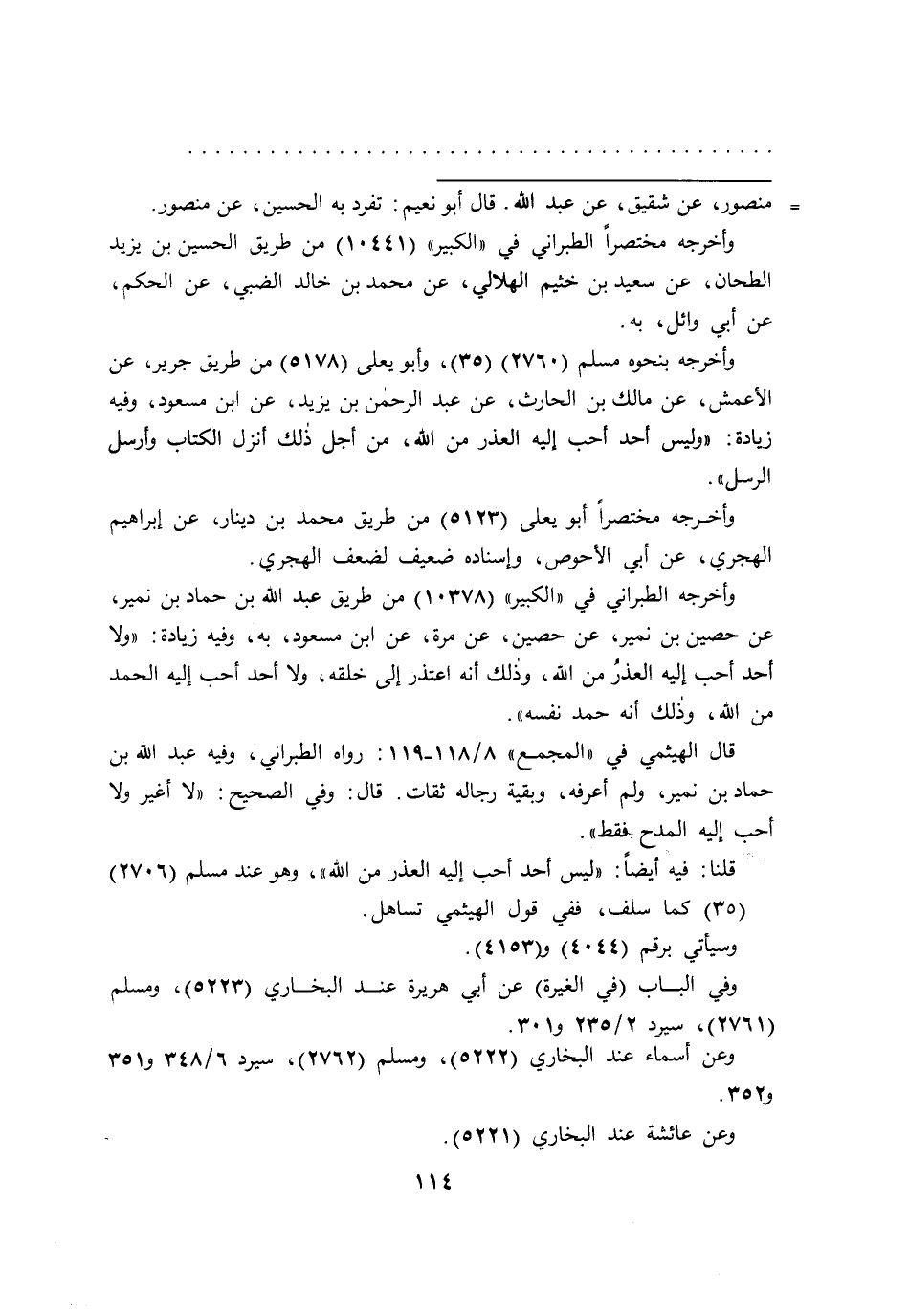 قلنا: فيه أيضاً: "ليس أحد أحب إليه العذر من الله"، وهو عند مسلم (٢٧٠٦) (٣٥) كما سلف، ففي قول الهيثمي تساهل.