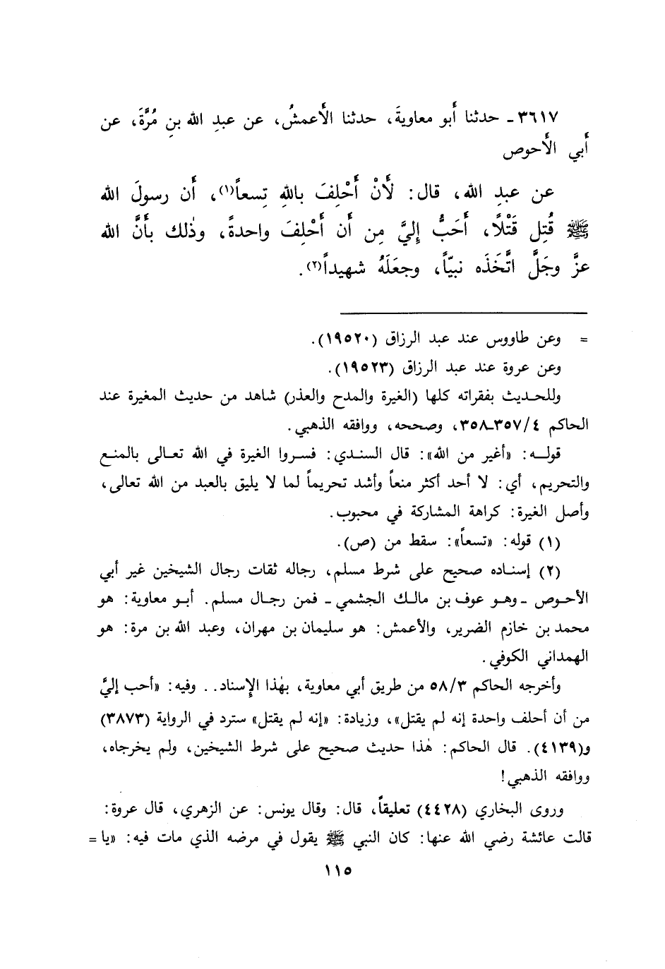 ٣٦١٧ - حَدَّثَنَا أَبُو مُعَاوِيَةَ، حَدَّثَنَا الْأَعْمَشُ، عَنْ عَبْدِ اللهِ بْنِ مُرَّةَ، عَنْ أَبِي الْأَحْوَصِ، عَنْ عَبْدِ اللهِ، قَالَ: " لَأَنْ أَحْلِفَ بِاللهِ تِسْعًا (١) ، إِنَّ رَسُولَ اللهِ صَلَّى اللهُ عَلَيْهِ وَسَلَّمَ قُتِلَ قَتْلًا، أَحَبُّ إِلَيَّ مِنْ أَنْ أَحْلِفَ وَاحِدَةً، وَذَلِكَ بِأَنَّ اللهَ عَزَّ وَجَلَّ اتَّخَذَهُ نَبِيًّا، وَجَعَلَهُ شَهِيدًا " (٢)