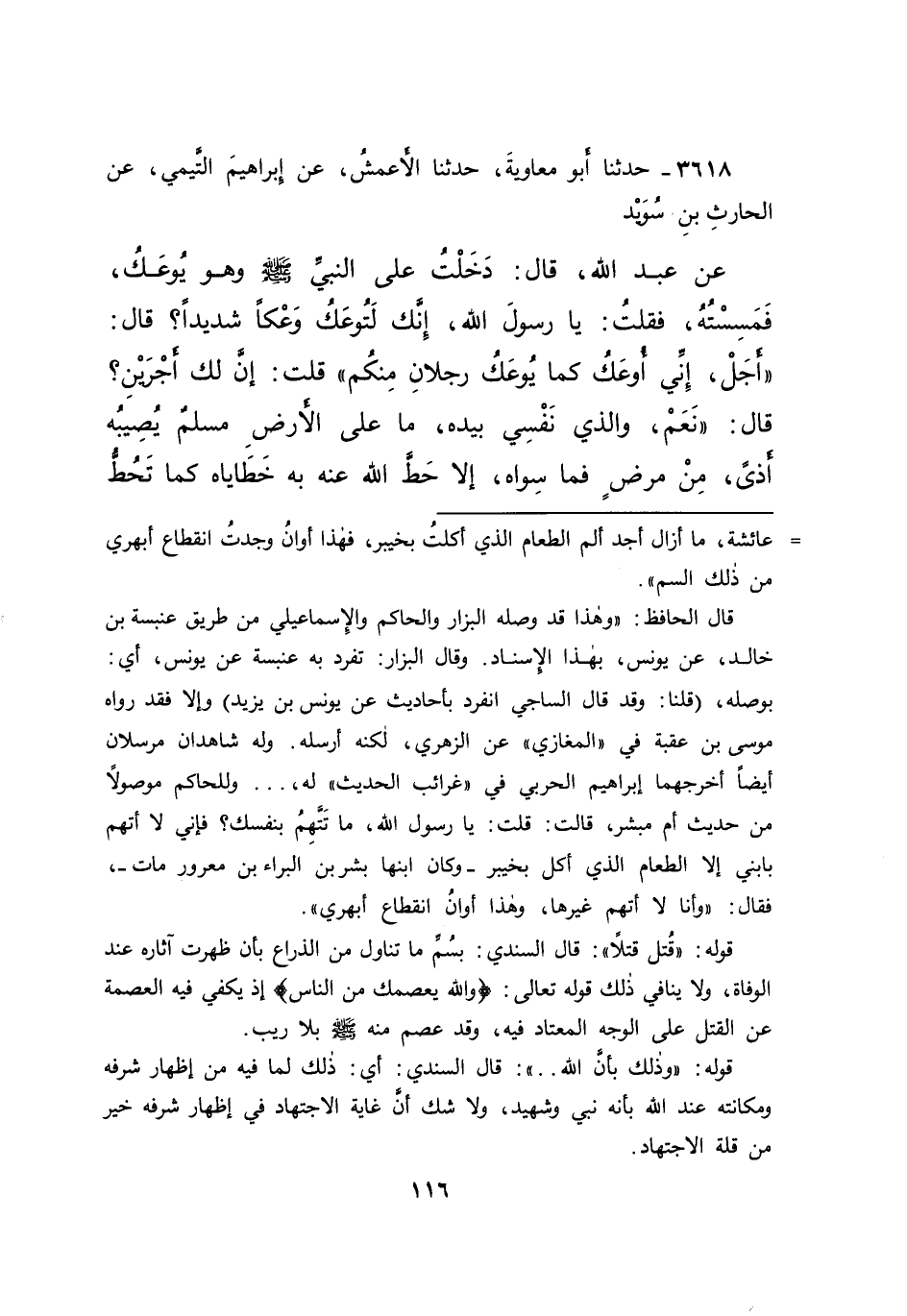 ٣٦١٨ - حَدَّثَنَا أَبُو مُعَاوِيَةَ، حَدَّثَنَا الْأَعْمَشُ، عَنْ إِبْرَاهِيمَ التَّيْمِيِّ، عَنْ الْحَارِثِ بْنِ سُوَيْدٍ، عَنْ عَبْدِ اللهِ، قَالَ: دَخَلْتُ عَلَى النَّبِيِّ صَلَّى اللهُ عَلَيْهِ وَسَلَّمَ وَهُوَ يُوعَكُ فَمَسِسْتُهُ، فَقُلْتُ: يَا رَسُولَ اللهِ، إِنَّكَ لَتُوعَكُ وَعْكًا شَدِيدًا؟ قَالَ: " أَجَلْ، إِنِّي أُوعَكُ كَمَا يُوعَكُ رَجُلَانِ مِنْكُمْ "، قُلْتُ: إِنَّ لَكَ أَجْرَيْنِ؟ قَالَ: " نَعَمْ، وَالَّذِي نَفْسِي بِيَدِهِ، مَا عَلَى الْأَرْضِ مُسْلِمٌ يُصِيبُهُ أَذًى، مِنْ مَرَضٍ فَمَا سِوَاهُ، إِلَّا حَطَّ اللهُ عَنْهُ بِهِ خَطَايَاهُ كَمَا تَحُطُّ