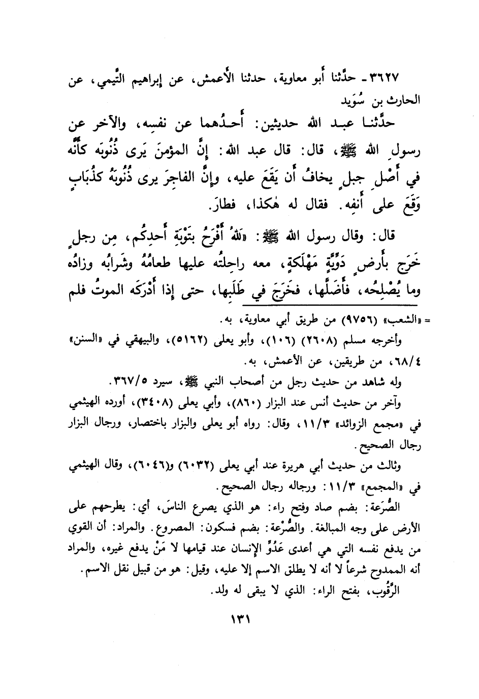 ٣٦٢٧ - حَدَّثَنَا أَبُو مُعَاوِيَةَ، حَدَّثَنَا الْأَعْمَشُ، عَنْ إِبْرَاهِيمَ التَّيْمِيِّ، عَنْ الْحَارِثِ بْنِ سُوَيْدٍ، حَدَّثَنَا عَبْدُ اللهِ، حَدِيثَيْنِ: أَحَدَهُمَا عَنْ نَفْسِهِ، وَالْآخَرَ عَنْ رَسُولِ اللهِ صَلَّى اللهُ عَلَيْهِ وَسَلَّمَ، قَالَ: قَالَ عَبْدُ اللهِ: " إِنَّ الْمُؤْمِنَ يَرَى ذُنُوبَهُ كَأَنَّهُ فِي أَصْلِ جَبَلٍ يَخَافُ أَنْ يَقَعَ عَلَيْهِ، وَإِنَّ الْفَاجِرَ يَرَى ذُنُوبَهُ كَذُبَابٍ وَقَعَ عَلَى أَنْفِهِ فَقَالَ لَهُ: هَكَذَا فَطَارَ "