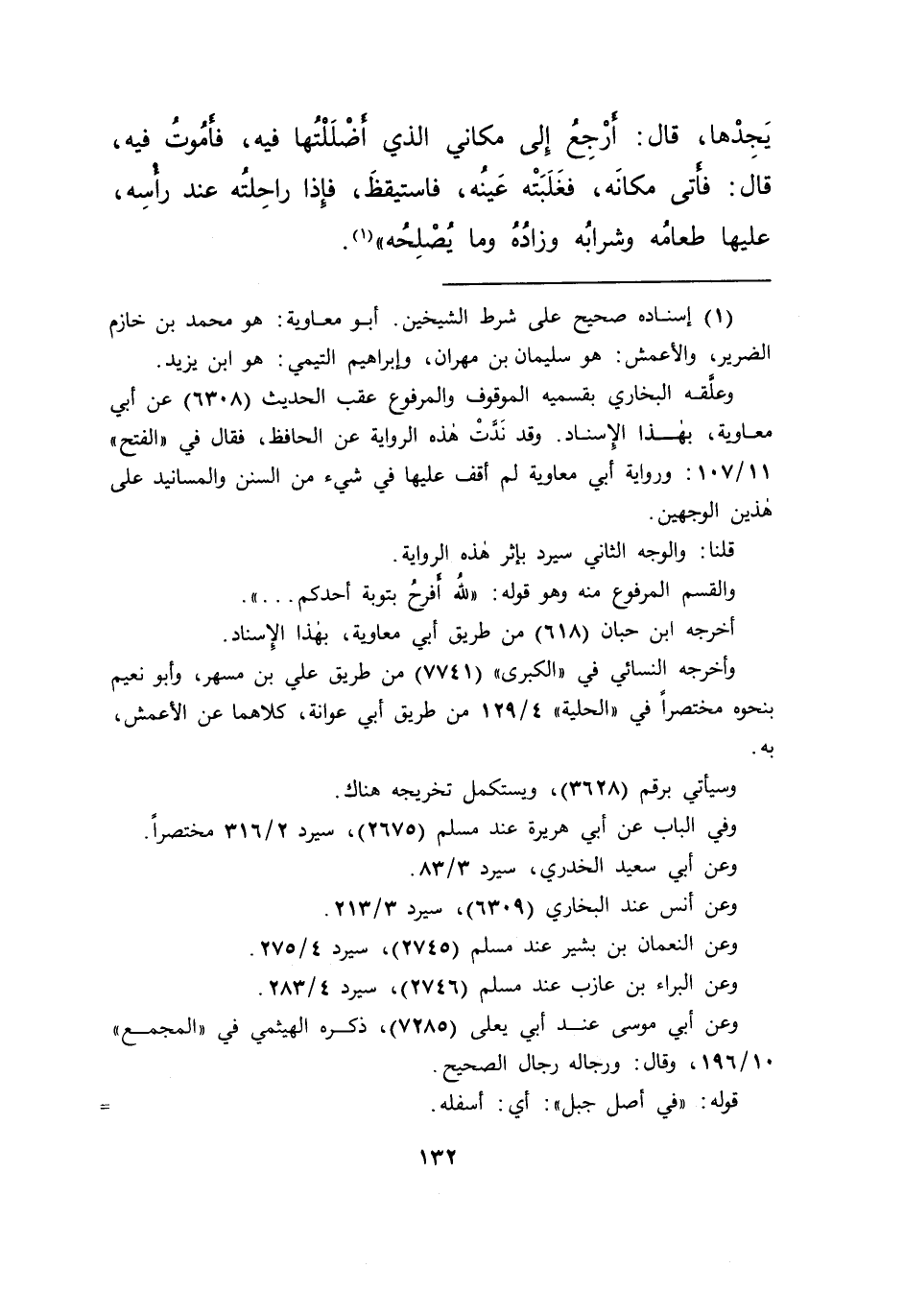 يَجِدْهَا، قَالَ: أَرْجِعُ إِلَى مَكَانِي الَّذِي أَضْلَلْتُهَا فِيهِ، فَأَمُوتُ فِيهِ، قَالَ: فَأَتَى مَكَانَهُ، فَغَلَبَتْهُ عَيْنُهُ، فَاسْتَيْقَظَ، فَإِذَا رَاحِلَتُهُ عِنْدَ رَأْسِهِ، عَلَيْهَا طَعَامُهُ وَشَرَابُهُ، وَزَادُهُ، وَمَا يُصْلِحُهُ " (١)