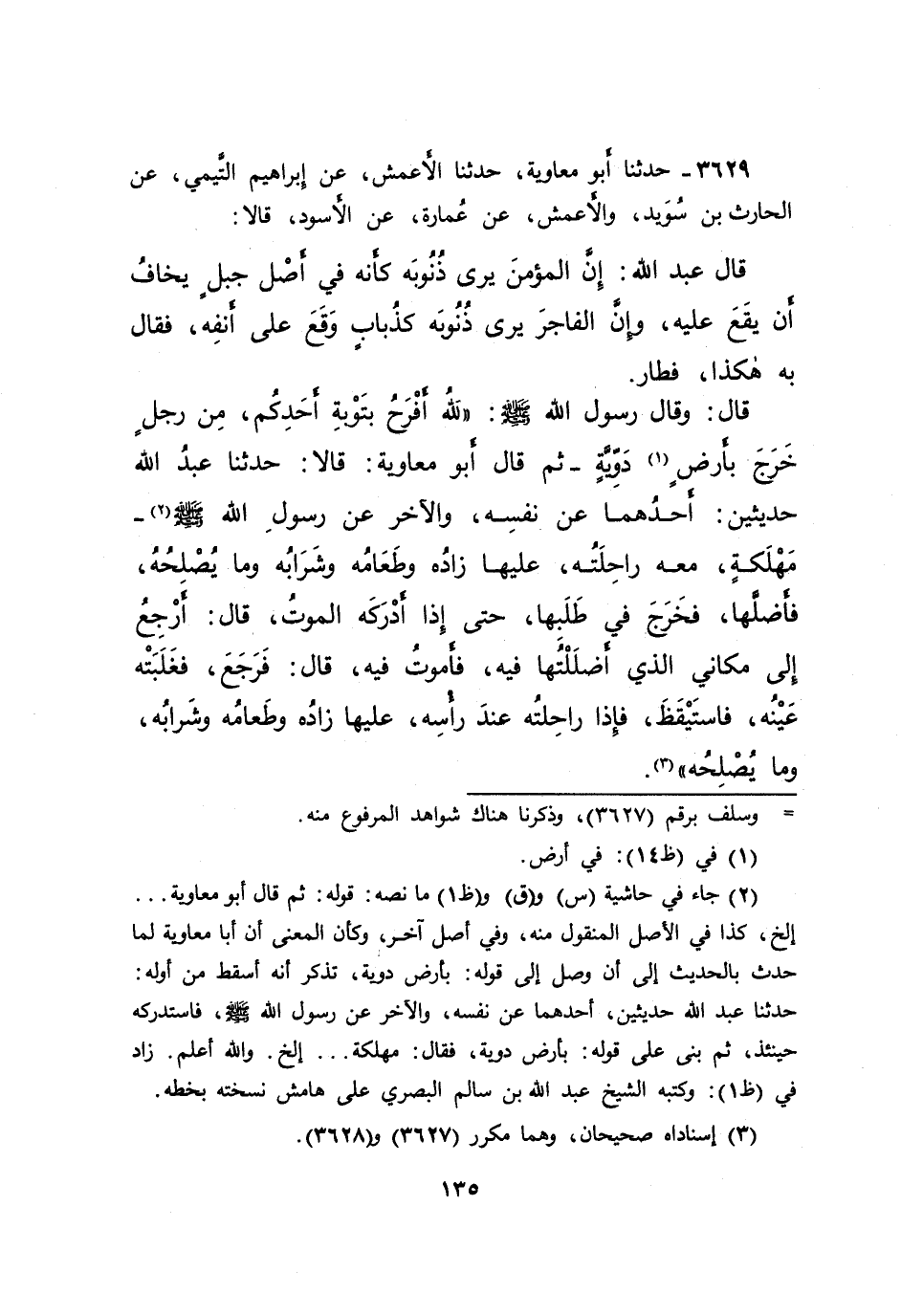 ٣٦٢٩ - حَدَّثَنَا أَبُو مُعَاوِيَةَ، حَدَّثَنَا الْأَعْمَشُ، عَنْ إِبْرَاهِيمَ التَّيْمِيِّ، عَنْ الْحَارِثِ بْنِ سُوَيْدٍ، وَالْأَعْمَشُ، عَنْ عُمَارَةَ، عَنْ الْأَسْوَدِ، قَالَا: قَالَ عَبْدُ اللهِ: " إِنَّ الْمُؤْمِنَ يَرَى ذُنُوبَهُ كَأَنَّهُ فِي أَصْلِ جَبَلٍ يَخَافُ أَنْ يَقَعَ عَلَيْهِ، وَإِنَّ الْفَاجِرَ يَرَى ذُنُوبَهُ كَذُبَابٍ وَقَعَ عَلَى أَنْفِهِ، فَقَالَ: بِهِ هَكَذَا، فَطَارَ "