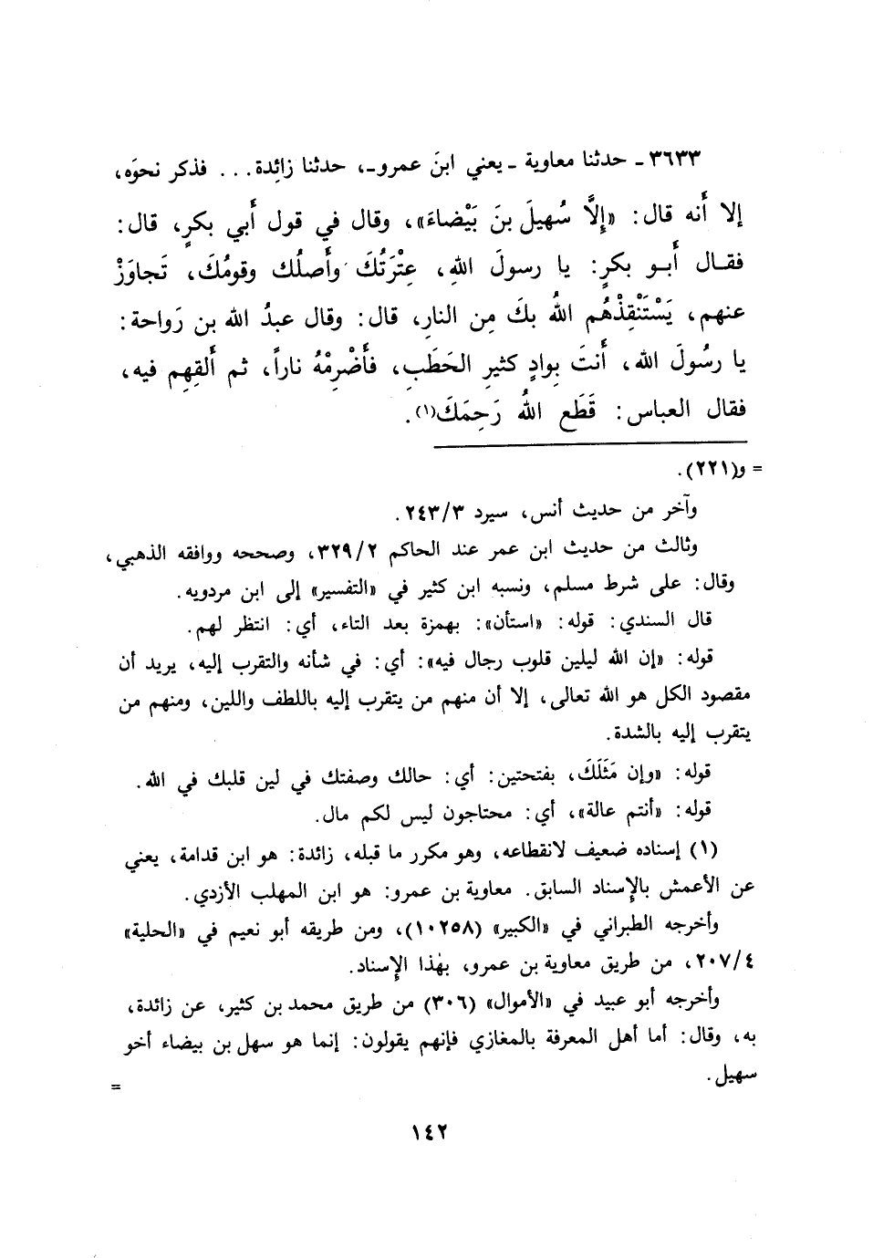٣٦٣٣ - حَدَّثَنَا أَبُو مُعَاوِيَةَ يَعْنِي ابْنَ عَمْرٍو، حَدَّثَنَا زَائِدَةُ، فَذَكَرَ نَحْوَهُ، إِلَّا أَنَّهُ قَالَ: " إِلَّا سُهَيْلُ ابْنُ بَيْضَاءَ "، وَقَالَ فِي قَوْلِ أَبِي بَكْرٍ، قَالَ: فَقَالَ أَبُو بَكْرٍ: يَا رَسُولَ اللهِ، عِتْرَتُكَ وَأَصْلُكَ وَقَوْمُكَ، تَجَاوَزْ عَنْهُمْ، يَسْتَنْقِذْهُمُ اللهُ بِكَ مِنَ النَّارِ، قَالَ: وَقَالَ عَبْدُ اللهِ بْنُ رَوَاحَةَ: يَا رَسُولَ اللهِ، أَنْتَ بِوَادٍ كَثِيرِ الْحَطَبِ، فَأَضْرِمْهُ نَارًا، ثُمَّ أَلْقِهِمْ فِيهِ، فَقَالَ الْعَبَّاسُ: قَطَعَ اللهُ رَحِمَكَ، (١)