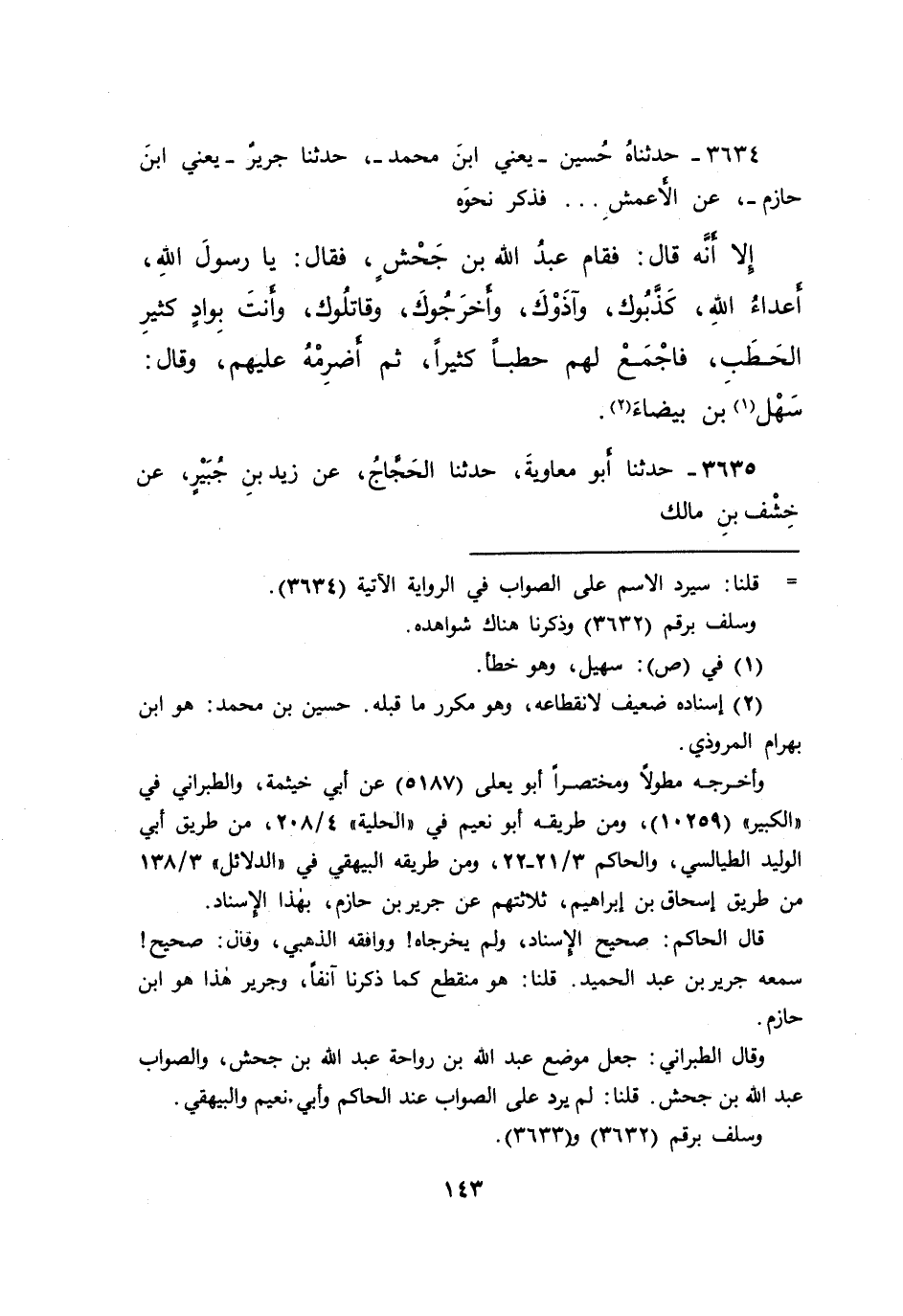 ٣٦٣٤ - حَدَّثَنَاهُ حُسَيْنٌ يَعْنِي ابْنَ مُحَمَّدٍ، حَدَّثَنَا جَرِيرٌ يَعْنِي ابْنَ حَازِمٍ، عَنْ الْأَعْمَشِ، فَذَكَرَ نَحْوَهُ إِلَّا أَنَّهُ قَالَ فَقَامَ عَبْدُ اللهِ بْنُ جَحْشٍ، فَقَالَ: يَا رَسُولَ اللهِ، أَعْدَاءُ اللهِ، كَذَّبُوكَ، وَآذَوْكَ، وَأَخْرَجُوكَ، وَقَاتَلُوكَ، وَأَنْتَ بِوَادٍ كَثِيرِ الْحَطَبِ، فَاجْمَعْ لَهُمْ حَطَبًا كَثِيرًا، ثُمَّ أَضْرِمْهُ عَلَيْهِمْ، وَقَالَ: سَهْلُ (١) ابْنُ بَيْضَاءَ (٢)