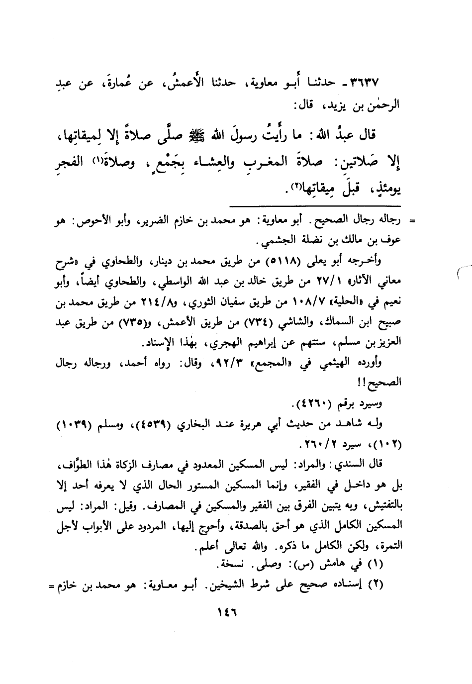 ٣٦٣٧ - حَدَّثَنَا أَبُو مُعَاوِيَةَ، حَدَّثَنَا الْأَعْمَشُ، عَنْ عُمَارَةَ، عَنْ عَبْدِ الرَّحْمَنِ بْنِ يَزِيدَ، قَالَ: قَالَ عَبْدُ اللهِ: " مَا رَأَيْتُ رَسُولَ اللهِ صَلَّى اللهُ عَلَيْهِ وَسَلَّمَ صَلَّى صَلَاةً إِلَّا لِمِيقَاتِهَا، إِلَّا صَلَاتَيْنِ: صَلَاةَ الْمَغْرِبِ وَالْعِشَاءِ بِجَمْعٍ، وَصَلَاةَ (١) الْفَجْرِ يَوْمَئِذٍ، قَبْلَ مِيقَاتِهَا " (٢)