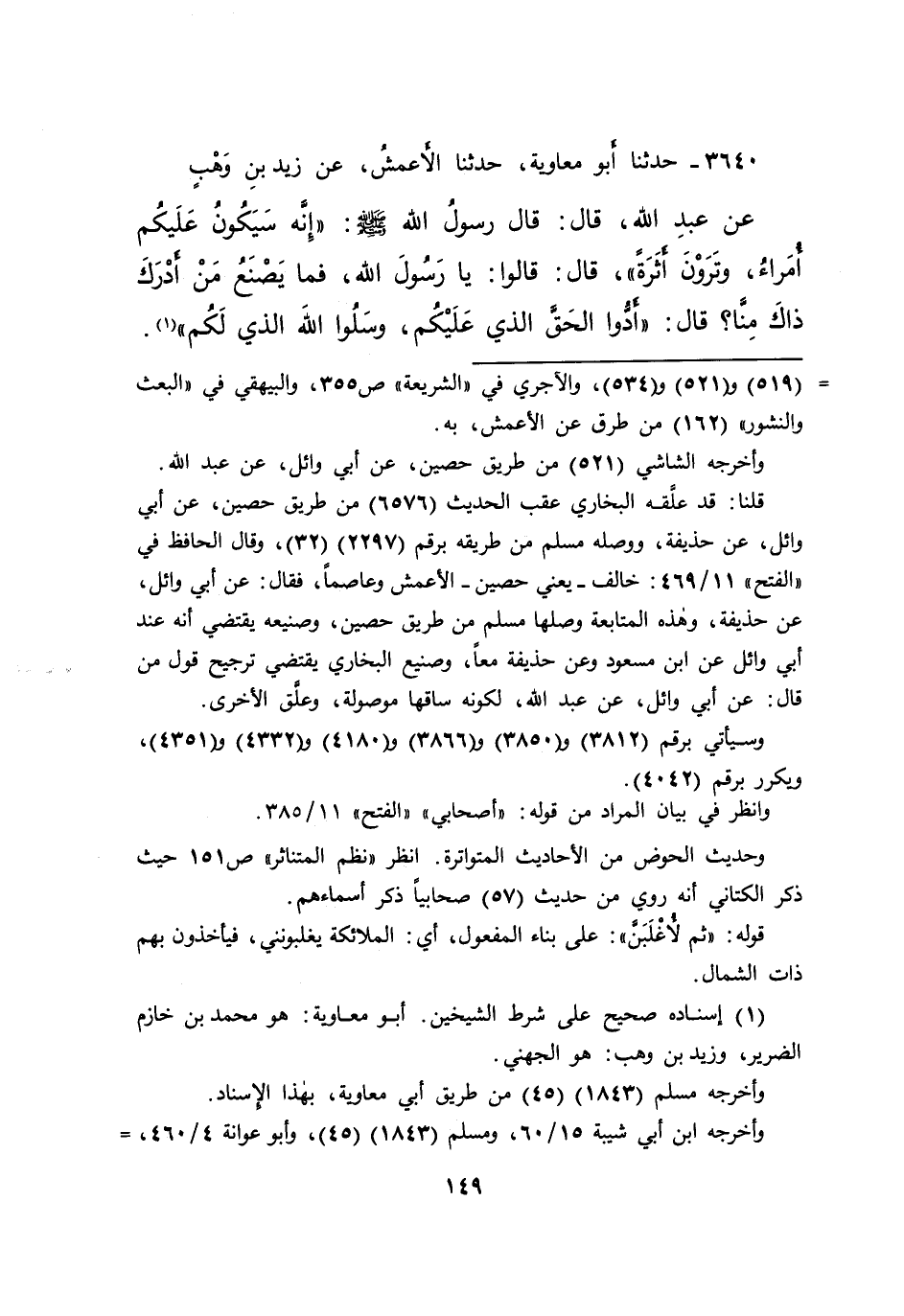 ٣٦٤٠ - حَدَّثَنَا أَبُو مُعَاوِيَةَ، حَدَّثَنَا الْأَعْمَشُ، عَنْ زَيْدِ بْنِ وَهْبٍ، عَنْ عَبْدِ اللهِ، قَالَ: قَالَ رَسُولُ اللهِ صَلَّى اللهُ عَلَيْهِ وَسَلَّمَ: " إِنَّهُ سَيَكُونُ عَلَيْكُمْ أُمَرَاءُ، وَتَرَوْنَ أَثَرَةً "، قَالَ: قَالُوا: يَا رَسُولَ اللهِ، فَمَا يَصْنَعُ مَنْ أَدْرَكَ ذَاكَ مِنَّا؟ قَالَ: " أَدُّوا الْحَقَّ الَّذِي عَلَيْكُمْ، وَسَلُوا اللهَ الَّذِي لَكُمْ " (١)