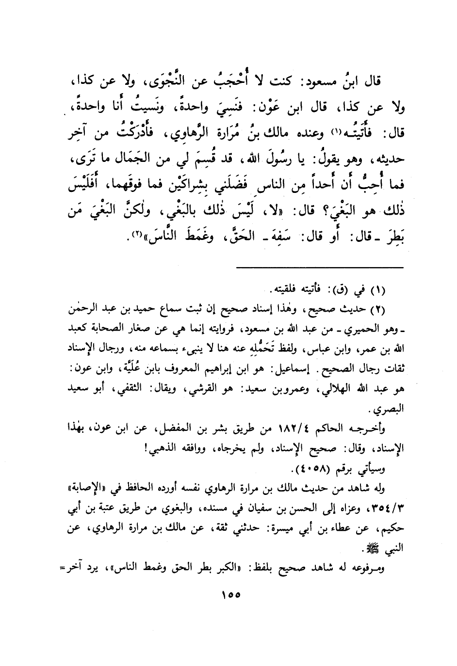 قَالَ ابْنُ مَسْعُودٍ: كُنْتُ لَا أُحْجَبُ عَنِ النَّجْوَى، وَلَا عَنْ كَذَا، وَلَا عَنْ كَذَا، قَالَ ابْنُ عَوْنٍ: فَنَسِيَ وَاحِدَةً، وَنَسِيتُ أَنَا وَاحِدَةً، قَالَ: فَأَتَيْتُهُ (١) وَعِنْدَهُ مَالِكُ بْنُ مُرَارَةَ الرَّهَاوِيُّ، فَأَدْرَكْتُ مِنْ آخِرِ حَدِيثِهِ، وَهُوَ يَقُولُ: يَا رَسُولَ اللهِ، قَدْ قُسِمَ لِي مِنَ الْجِمَالِ مَا تَرَى، فَمَا أُحِبُّ أَنَّ أَحَدًا مِنَ النَّاسِ فَضَلَنِي بِشِرَاكَيْنِ فَمَا فَوْقَهُمَا، أَفَلَيْسَ ذَلِكَ هُوَ الْبَغْيُ؟، قَالَ: " لَا، لَيْسَ ذَلِكَ بِالْبَغْيِ، وَلَكِنَّ الْبَغْيَ مَنْ بَطِرَ - قَالَ: أَوْ قَالَ: سَفِهَ - الْحَقَّ، وَغَمَطَ النَّاسَ " (٢)