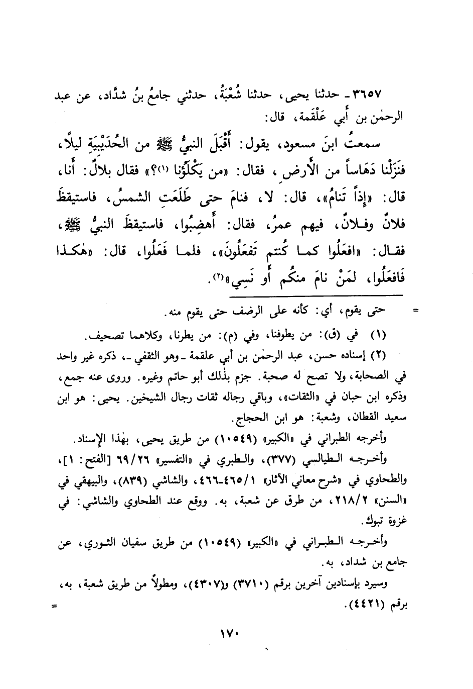 ٣٦٥٧ - حَدَّثَنَا يَحْيَى، حَدَّثَنَا شُعْبَةُ، حَدَّثَنِي جَامِعُ بْنُ شَدَّادٍ، عَنْ عَبْدِ الرَّحْمَنِ بْنِ أَبِي عَلْقَمَةَ، قَالَ: سَمِعْتُ ابْنَ مَسْعُودٍ، يَقُولُ: أَقْبَلَ النَّبِيُّ صَلَّى اللهُ عَلَيْهِ وَسَلَّمَ مِنَ الْحُدَيْبِيَةِ لَيْلًا، فَنَزَلْنَا دَهَاسًا مِنَ الْأَرْضِ، فَقَالَ: " مَنْ يَكْلَؤُنَا (١) ؟ " فَقَالَ بِلَالٌ: أَنَا، قَالَ: " إِذًا تَنَامَ "، قَالَ: لَا، فَنَامَ حَتَّى طَلَعَتِ الشَّمْسُ، فَاسْتَيْقَظَ فُلَانٌ وَفُلَانٌ، فِيهِمْ عُمَرُ، فَقَالَ: أَهْضِبُوا، فَاسْتَيْقَظَ النَّبِيُّ صَلَّى اللهُ عَلَيْهِ وَسَلَّمَ، فَقَالَ: " افْعَلُوا مَا كُنْتُمْ تَفْعَلُونَ "، فَلَمَّا فَعَلُوا، قَالَ: " هَكَذَا فَافْعَلُوا، لِمَنْ نَامَ مِنْكُمْ أَوْ نَسِيَ " (٢)