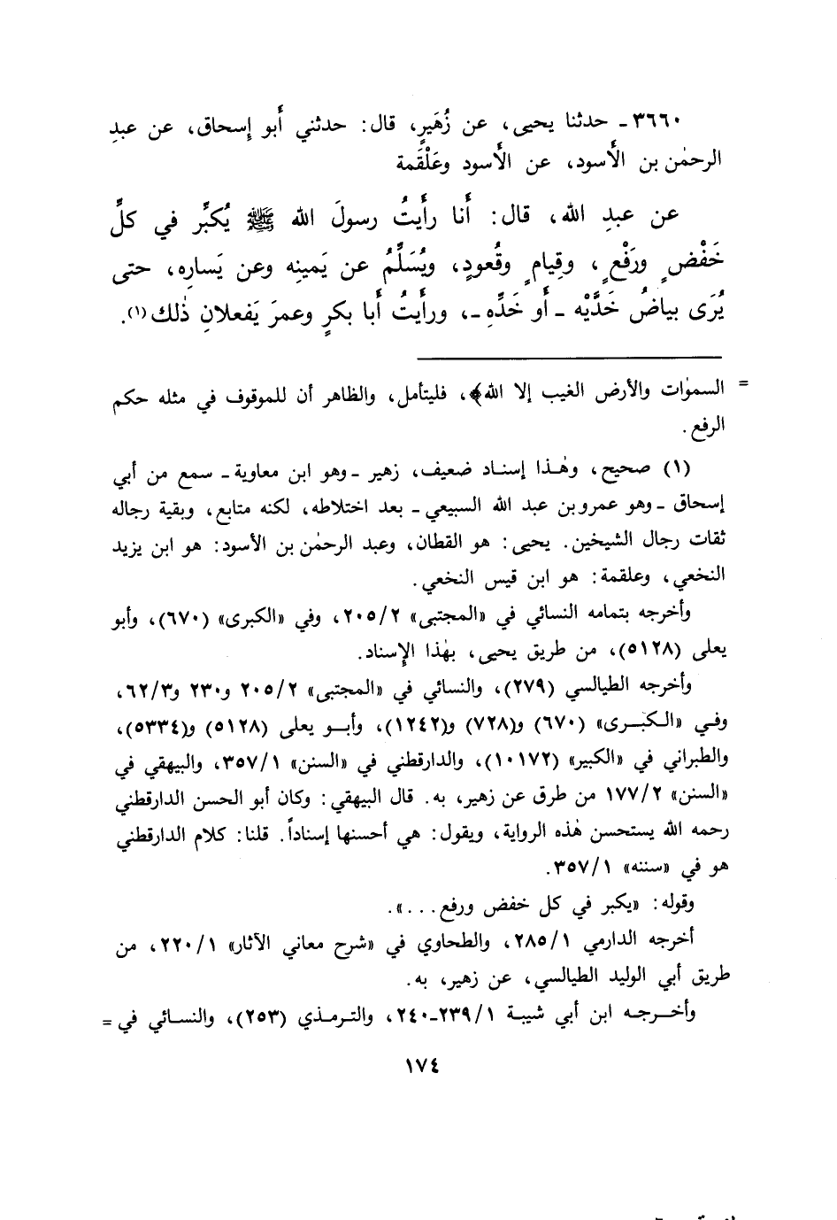 ٣٦٦٠ - حَدَّثَنَا يَحْيَى، عَنْ زُهَيْرٍ، قَالَ: حَدَّثَنِي أَبُو إِسْحَاقَ، عَنْ عَبْدِ الرَّحْمَنِ بْنِ الْأَسْوَدِ، عَنِ الْأَسْوَدِ، وَعَلْقَمَةَ، عَنْ عَبْدِ اللهِ، قَالَ: أَنَا رَأَيْتُ رَسُولَ اللهِ صَلَّى اللهُ عَلَيْهِ وَسَلَّمَ " يُكَبِّرُ فِي كُلِّ خَفْضٍ وَرَفْعٍ، وَقِيَامٍ وَقُعُودٍ، وَيُسَلِّمُ عَنْ يَمِينِهِ وَعَنْ يَسَارِهِ، حَتَّى يُرَى بَيَاضُ خَدَّيْهِ - أَوْ خَدِّهِ - " وَرَأَيْتُ أَبَا بَكْرٍ وَعُمَرَ يَفْعَلَانِ ذَلِكَ (١)