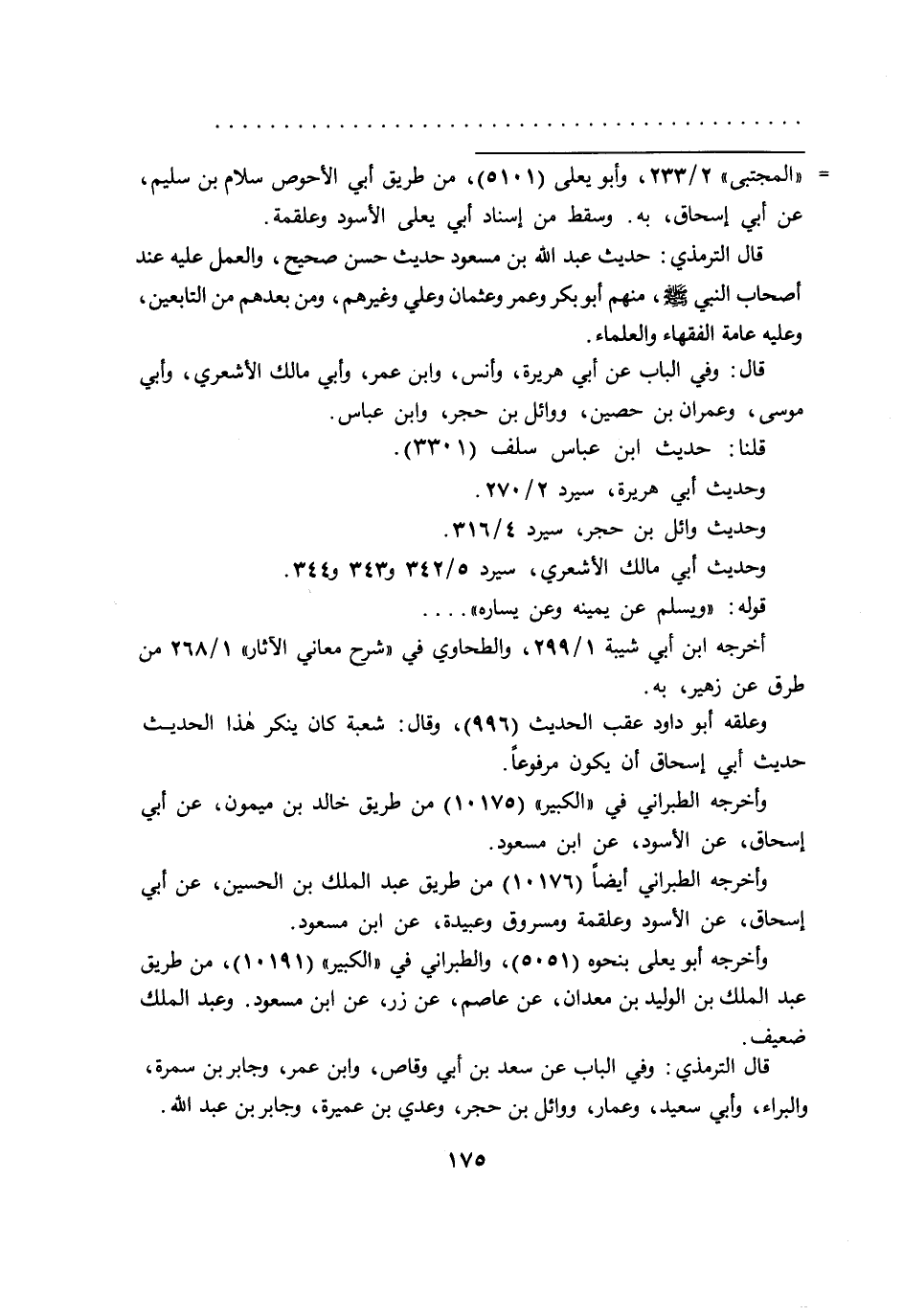 قال الترمذي: حديث عبد الله بن مسعود حديث حسن صحيح، والعمل عليه عند أصحاب النبي صَلَّى اللهُ عَلَيْهِ وَسَلَّمَ، منهم أبو بكر وعمر وعثمان وعلي وغيرهم، ومن بعدهم من التابعين، وعليه عامة الفقهاء والعلماء.
