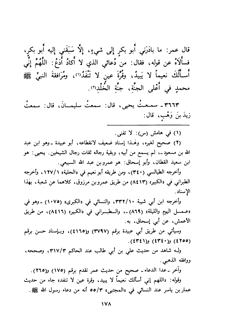 وقوله: "اللهم إني أسألك نعيماً لا يبيد، وقرة عين لا تنفد" جاء من حديث عمار بن ياسر عند النسائي في "المجتبى" ٣/٥٥ أنه من دعاء رسول الله صَلَّى اللهُ عَلَيْهِ وَسَلَّمَ.
