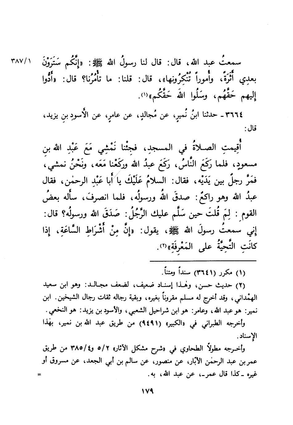 (٢) حديث حسن، وهذا إسناد ضعيف، لضعف مجالد: وهو ابن سعيد الهمْداني، وقد أخرج له مسلم مقروناً بغيره، وبقية رجاله ثقات رجال الشيخين. ابن نمير: هو عبد الله، وعامر: هو ابن شراحيل الشعبي، والأسود بن يزيد: هو النخعي.