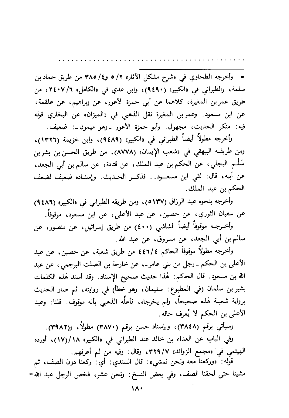 وأخرجه مطولاً موقوفاً الحاكم ٤/٤٤٦ من طريق شعبة، عن حصين، عن عبد الأعلى بن الحكم -رجل من بني عامر-، عن خارجة بن الصلت البرجمي، عن عبد الله بن مسعود. قال الحاكم: هذا حديث صحيح الإسناد. وقد أسند هذه الكلمات بشير بن سلمان (في المطبوع: سليمان، وهو خطأ) في روايته، ثم صار الحديث برواية شعبة هذه صحيحاً، ولم يخرجاه، فأعله الذهبي بأنه موقوف. قلنا: وعبد الأعلى بن الحكم لا يعرف حاله.