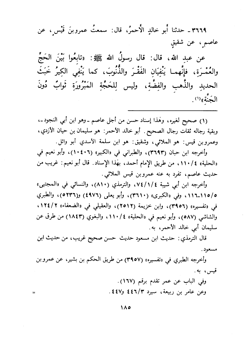 ٣٦٦٩ - حَدَّثَنَا أَبُو خَالِدٍ الْأَحْمَرُ، قَالَ: سَمِعْتُ عَمْرَو بْنَ قَيْسٍ، عَنْ عَاصِمٍ، عَنْ شَقِيقٍ، عَنْ عَبْدِ اللهِ، قَالَ: قَالَ رَسُولُ اللهِ صَلَّى اللهُ عَلَيْهِ وَسَلَّمَ: " تَابِعُوا بَيْنَ الْحَجِّ وَالْعُمْرَةِ، فَإِنَّهُمَا يَنْفِيَانِ الْفَقْرَ وَالذُّنُوبَ، كَمَا يَنْفِي الْكِيرُ خَبَثَ الْحَدِيدِ وَالذَّهَبِ وَالْفِضَّةِ، وَلَيْسَ لِلْحَجَّةِ الْمَبْرُورَةِ ثَوَابٌ دُونَ الْجَنَّةِ " (١)