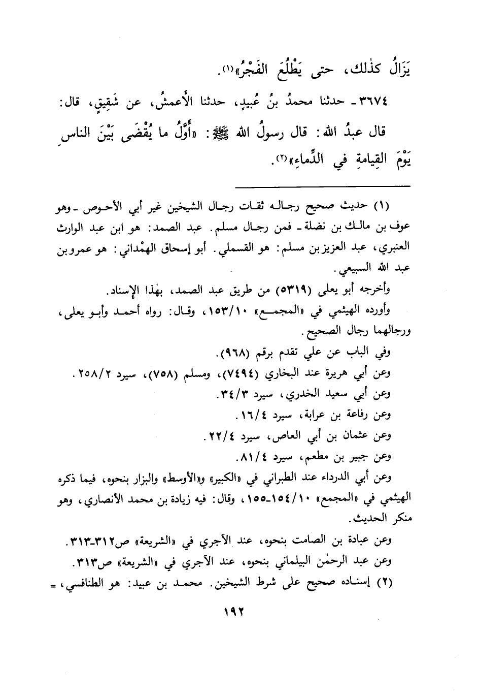 ٣٦٧٤ - حَدَّثَنَا مُحَمَّدُ بْنُ عُبَيْدٍ، حَدَّثَنَا الْأَعْمَشُ، عَنْ شَقِيقٍ، قَالَ: قَالَ عَبْدُ اللهِ: قَالَ رَسُولُ اللهِ صَلَّى اللهُ عَلَيْهِ وَسَلَّمَ: " أَوَّلُ مَا يُقْضَى بَيْنَ النَّاسِ يَوْمَ الْقِيَامَةِ فِي الدِّمَاءِ " (٢)