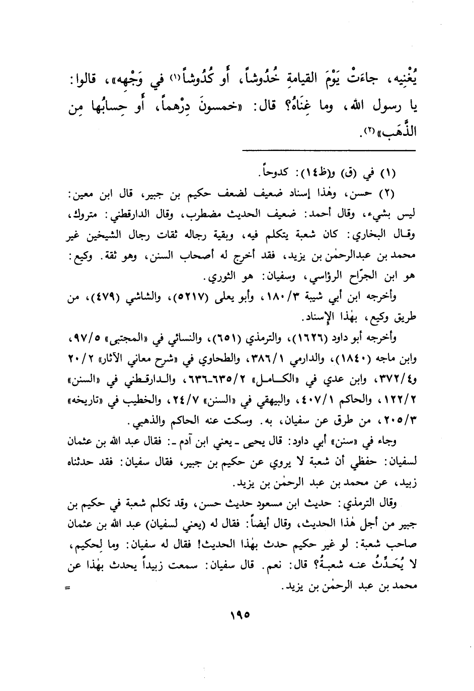 وقال الترمذي: حديث ابن مسعود حديث حسن، وقد تكلم شعبة في حكيم بن جبير من أجل هذا الحديث، وقال أيضاً: فقال له (يعني لسفيان) عبد الله بن عثمان صاحب شعبة: لو غير حكيم حدث بهذا الحديث! فقال له سفيان: وما لِحكيم، لا يحَدث عنه شعبة؟ قال: نعم. قال سفيان: سمعت زبيداً يحدث بهذا عن محمد بن عبد الرحمن بن يزيد.=
