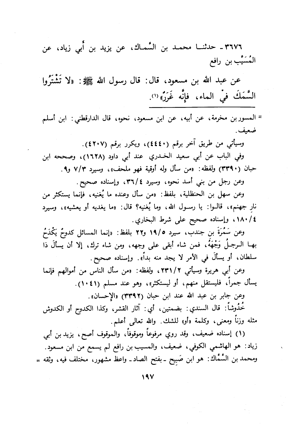 ٣٦٧٦ - حَدَّثَنَا مُحَمَّدُ بْنُ السَّمَّاكِ، عَنْ يَزِيدَ بْنِ أَبِي زِيَادٍ، عَنِ الْمُسَيَّبِ بْنِ رَافِعٍ، عَنْ عَبْدِ اللهِ بْنِ مَسْعُودٍ، قَالَ: قَالَ رَسُولُ اللهِ صَلَّى اللهُ عَلَيْهِ وَسَلَّمَ: " لَا تَشْتَرُوا السَّمَكَ فِي الْمَاءِ، فَإِنَّهُ غَرَرٌ " (١)