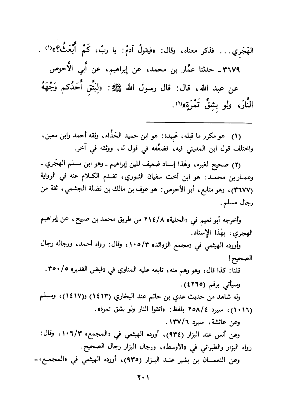 ٣٦٧٩ - حَدَّثَنَا عَمَّارُ بْنُ مُحَمَّدٍ، عَنْ إِبْرَاهِيمَ، عَنْ أَبِي الْأَحْوَصِ، عَنْ عَبْدِ اللهِ، قَالَ: قَالَ رَسُولُ اللهِ صَلَّى اللهُ عَلَيْهِ وَسَلَّمَ: " لِيَتَّقِ أَحَدُكُمْ وَجْهَهُ النَّارَ، وَلَوْ بِشِقِّ تَمْرَةٍ " (٢)
