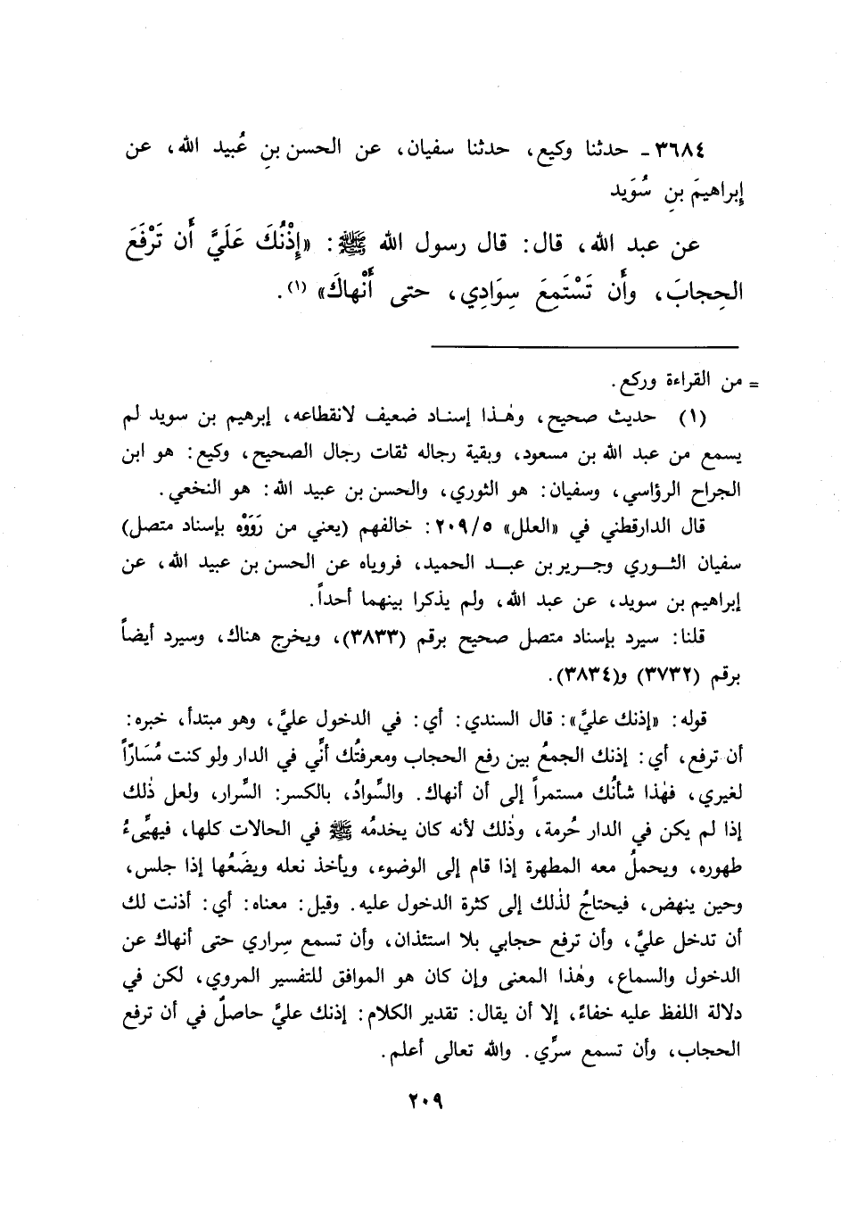 ٣٦٨٤ - حَدَّثَنَا وَكِيعٌ، حَدَّثَنَا سُفْيَانُ، عَنِ الْحَسَنِ بْنِ عُبَيْدِ اللهِ، عَنْ إِبْرَاهِيمَ بْنِ سُوَيْدٍ، عَنْ عَبْدِ اللهِ، قَالَ: قَالَ رَسُولُ اللهِ صَلَّى اللهُ عَلَيْهِ وَسَلَّمَ: " إِذْنُكَ عَلَيَّ أَنْ تَرْفَعَ الْحِجَابَ، وَأَنْ تَسْتَمِعَ سِوَادِي، حَتَّى أَنْهَاكَ " (١)
