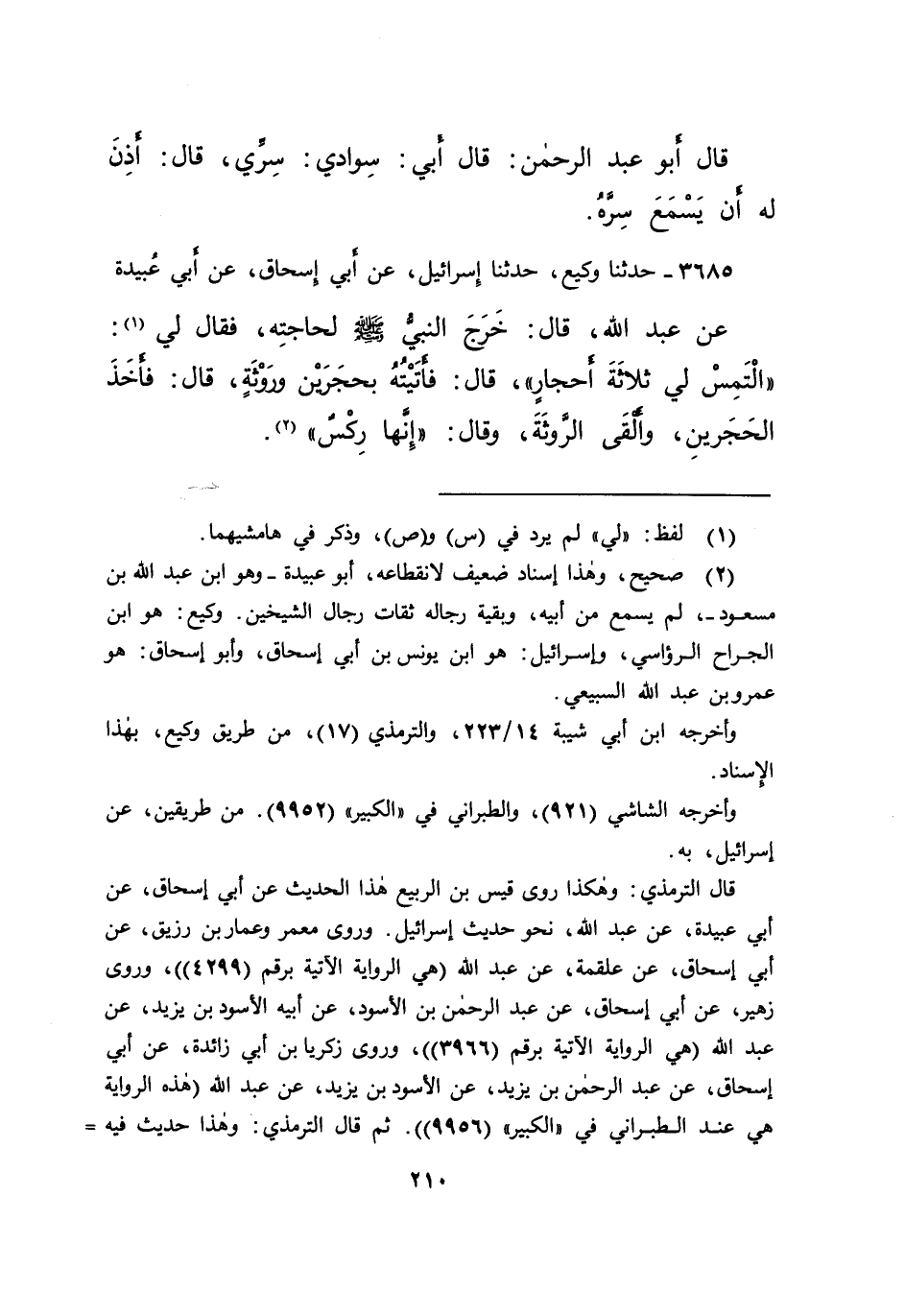 ٣٦٨٥ - حَدَّثَنَا وَكِيعٌ، حَدَّثَنَا إِسْرَائِيلُ، عَنْ أَبِي إِسْحَاقَ، عَنْ أَبِي عُبَيْدَهَ، عَنْ عَبْدِ اللهِ، قَالَ: خَرَجَ النَّبِيُّ صَلَّى اللهُ عَلَيْهِ وَسَلَّمَ لِحَاجَتِهِ، فَقَالَ لِي (١) : " الْتَمِسْ لِي ثَلَاثَةَ أَحْجَارٍ "، قَالَ: فَأَتَيْتُهُ بِحَجَرَيْنِ وَرَوْثَةٍ، قَالَ: فَأَخَذَ الْحَجَرَيْنِ، وَأَلْقَى الرَّوْثَةَ، وَقَالَ: " إِنَّهَا رِكْسٌ " (٢)